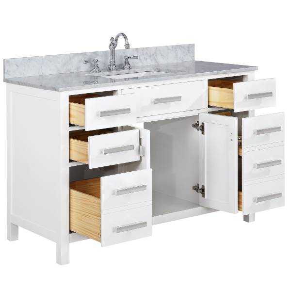 - 3/4″ Thick Seamless Carrara Marble Countertop with Pre-Drilled Holes to accommodate 8″ Wide Spread Faucets