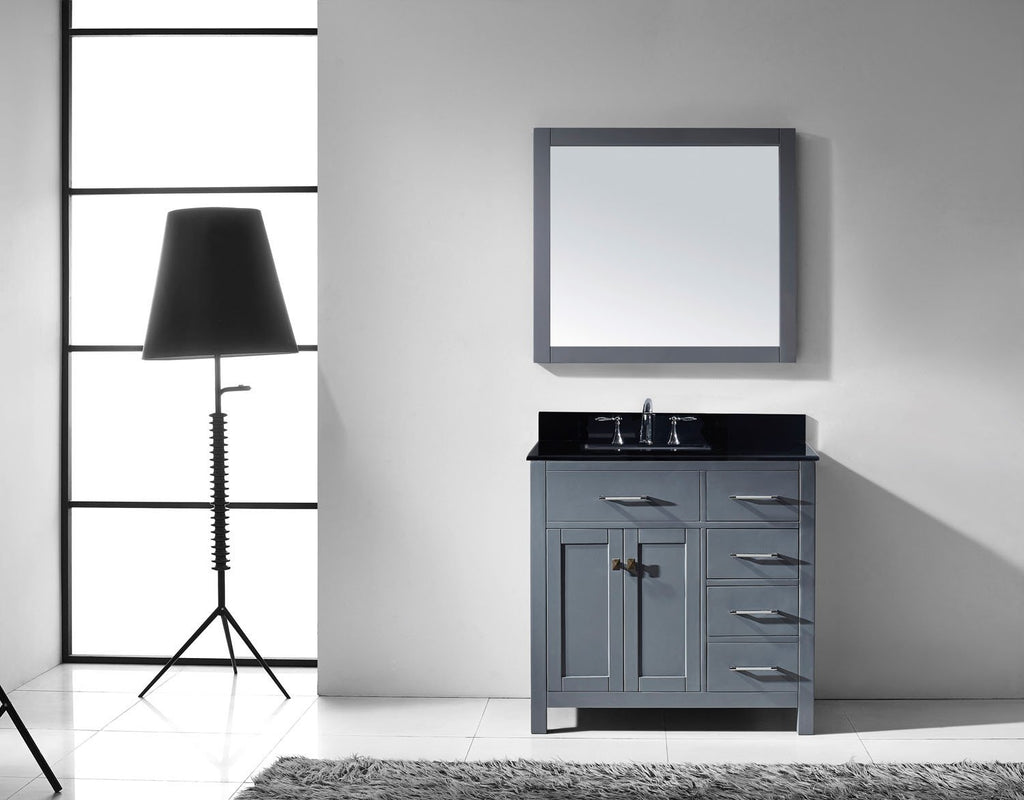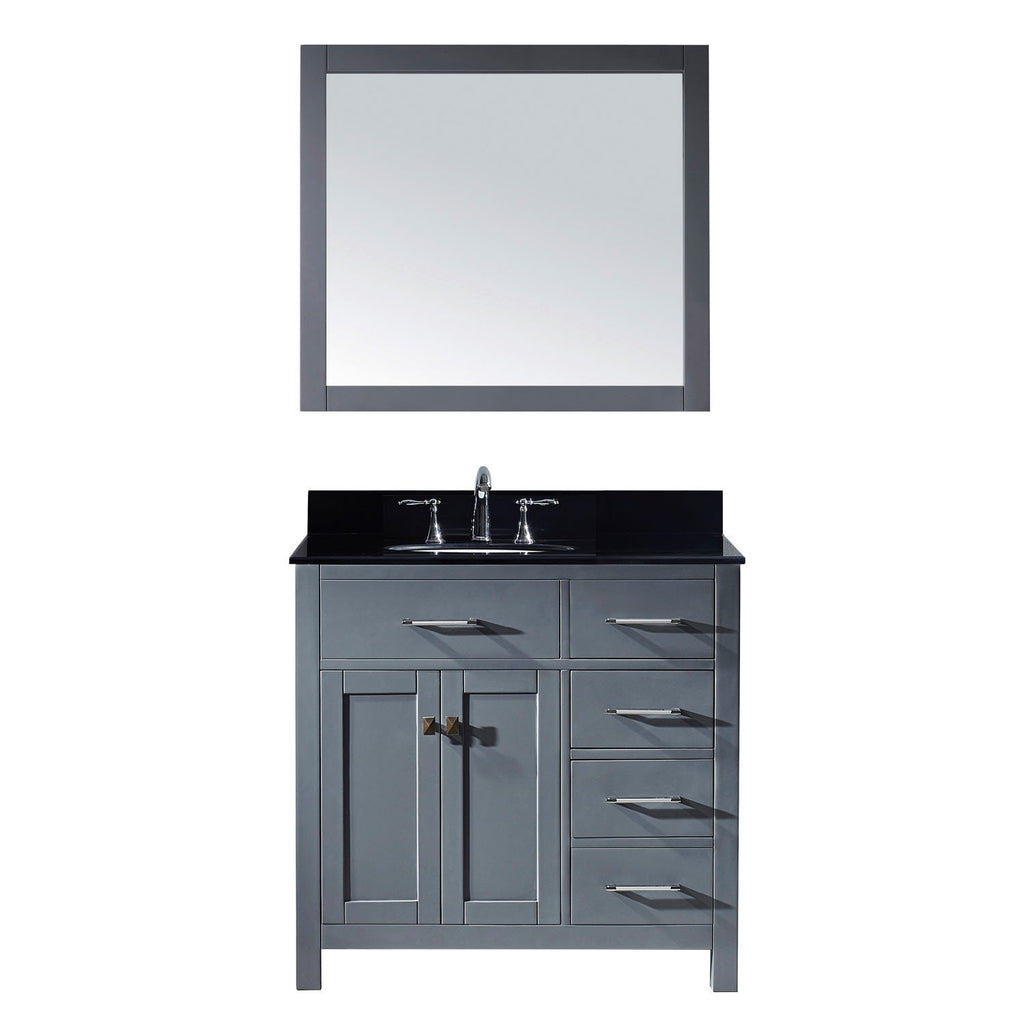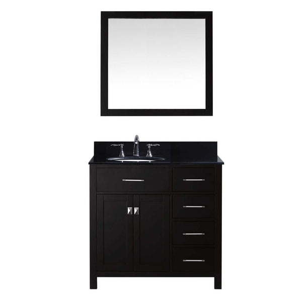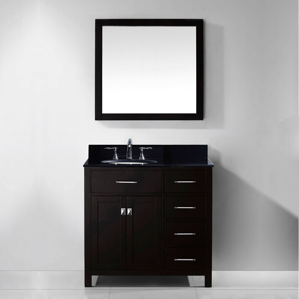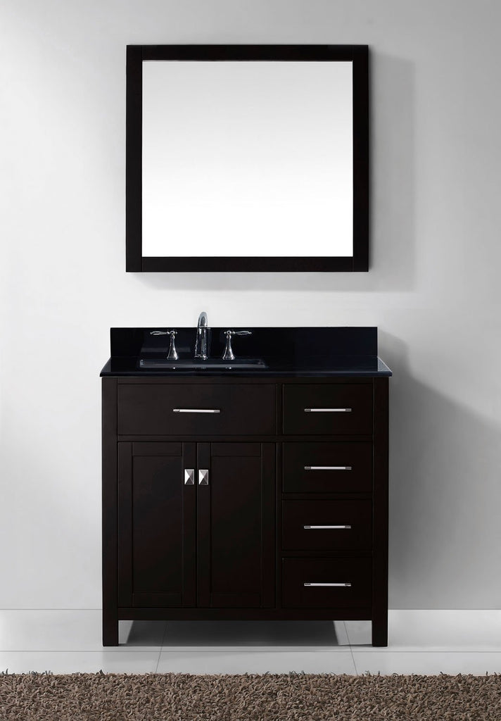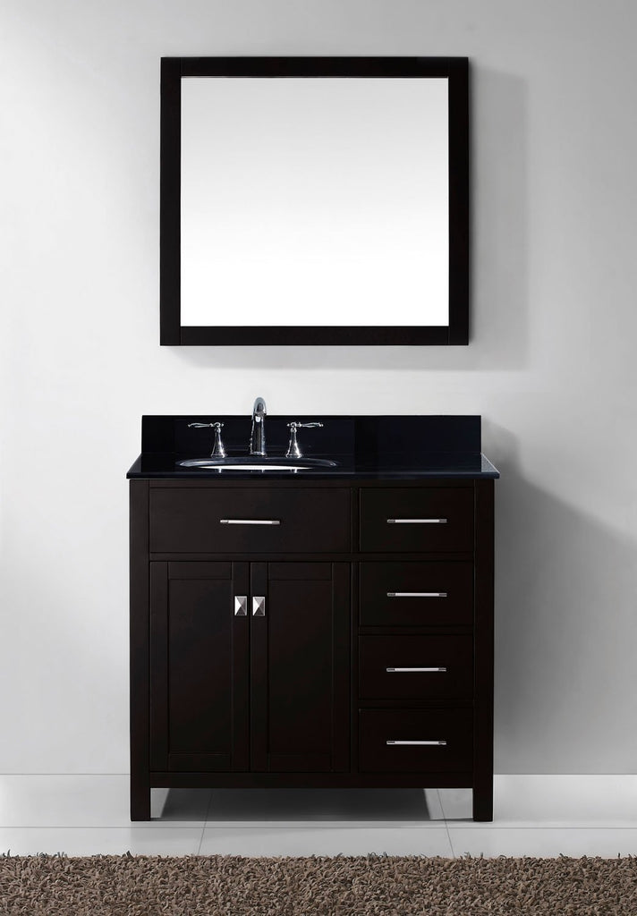 Details of the Caroline Parkway 36" Single Bathroom Vanity in Espresso with Black Galaxy Granite Top and Round Sink with Mirror