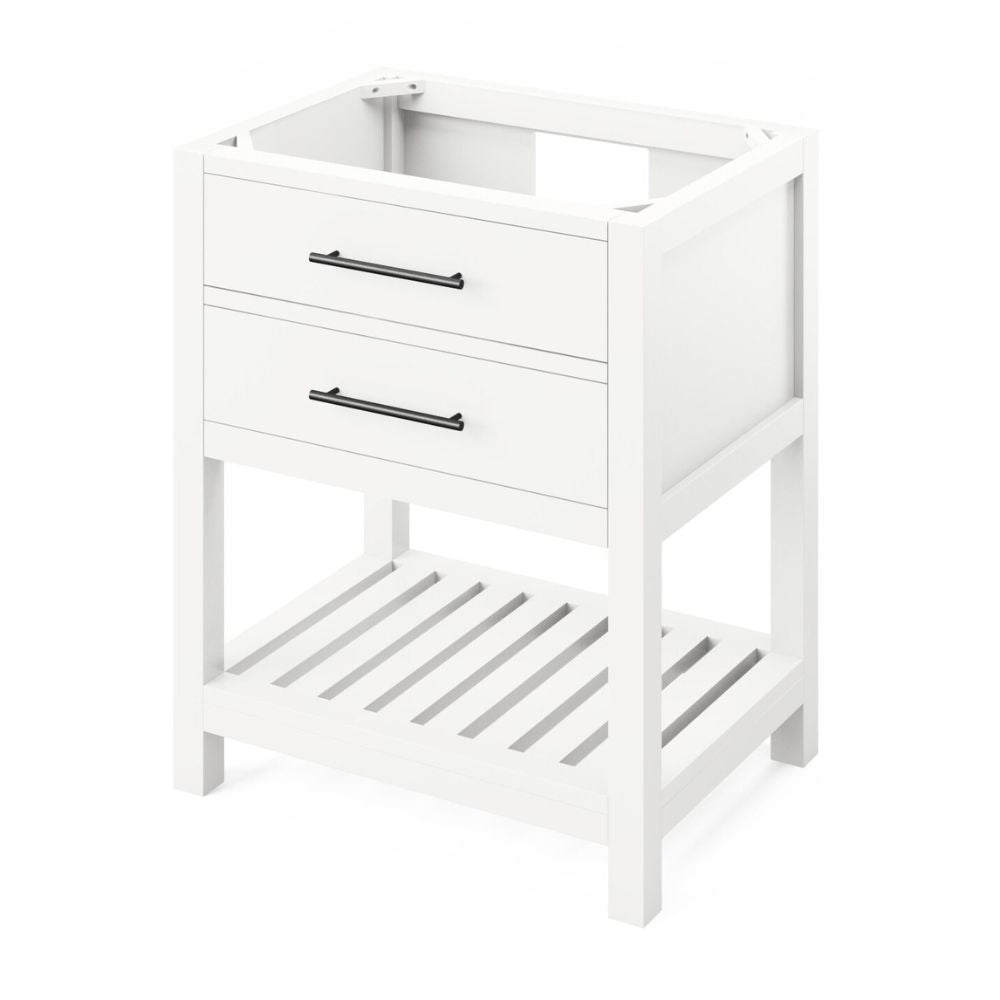 Escape to the seaside with the Wavecrest vanity. Crisp, clean edges and a slatted bottom shelf evoke a coastal calm feeling. False front drawers are transformed into hidden tipout storage space with solid hardwood custom sized tipout trays. Beneath the tipout storage is a solid hardwood dovetail drawer with full extension soft-close undermount slides. White vanities are adorned with Matte Black pulls, Grey vanities with Satin Nickel pulls; and Hale Blue and Forest Green with Satin Bronze pulls. Top and rectangular porcelain bowl are included but not assembled. See our video in the Highlights section for more information. The included top has three holes cut for an 8” widespread faucet, and a 4” tall backsplash is included. The vanity top is designed to overhang ½” on each side of the vanity.