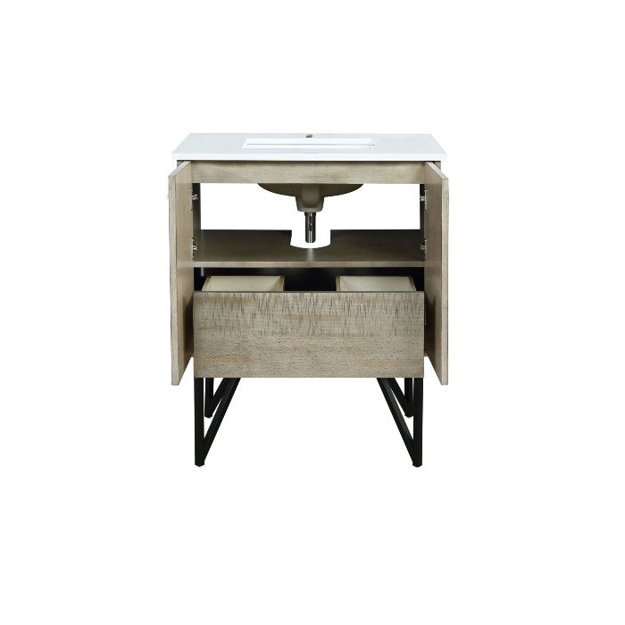 Details of the Lancy Modern 30 Inch Rustic Acacia Bathroom Vanity, White Quartz Top, White Square Sink, and Labaro Brushed Nickel Faucet Set by Lexora | LLC30SKSOS000FBN