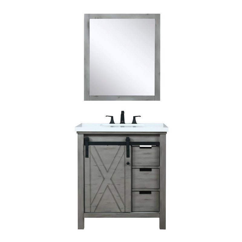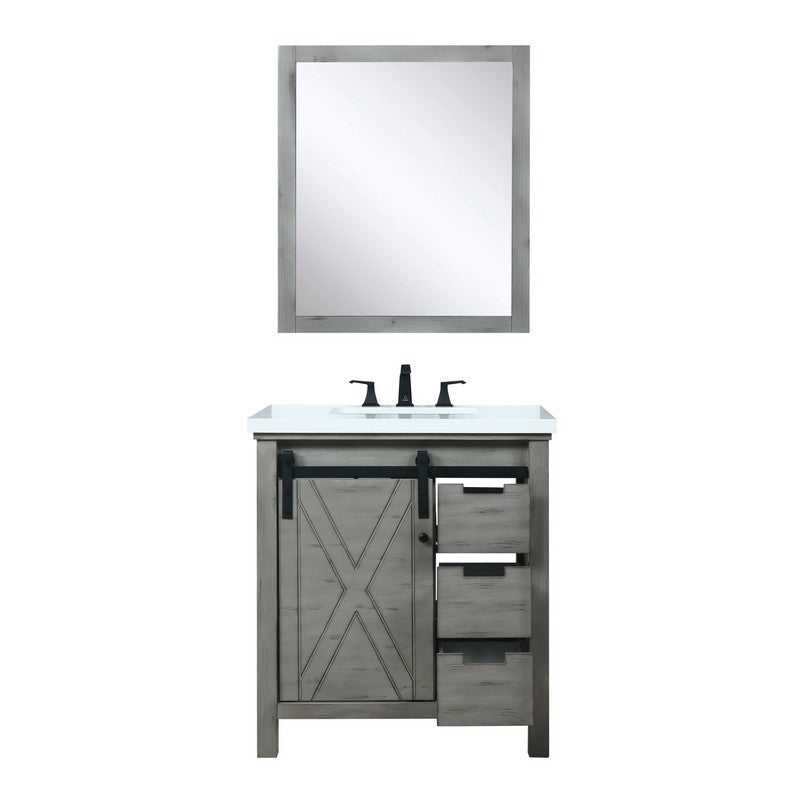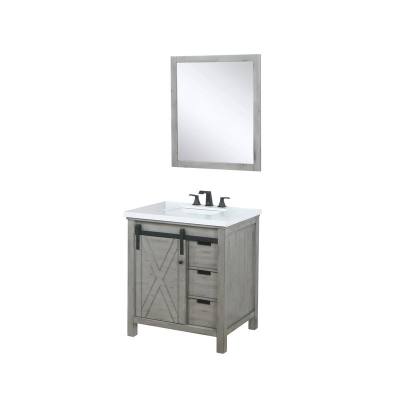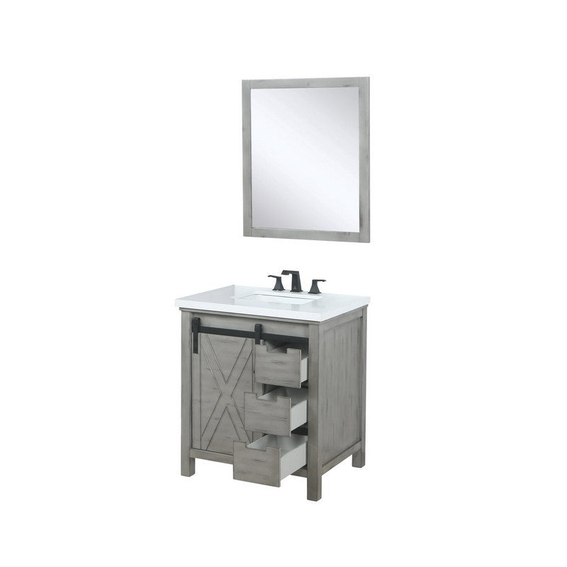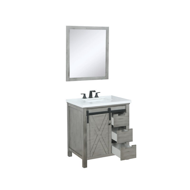 Lexora Marsyas 30 Inch Ash Grey Single Vanity, White Quartz Top, White Square Sink and 28 Inch Mirror w/ Faucet | LM342230SHCSM28F