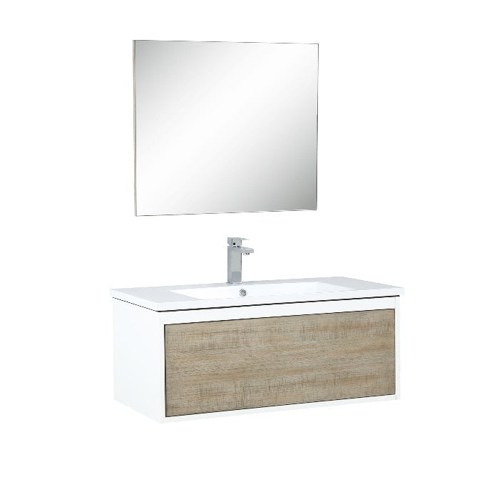 Details of the Scopi 36 Inch Rustic Acacia Bathroom Vanity, Acrylic Composite Top with Integrated Sink, Balzani Gun Metal Faucet Set, and 28 Inch Frameless Mirror by Lexora | LSC36SRAOSM28FGM
