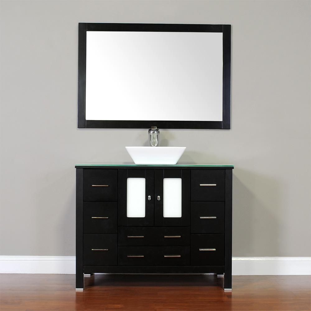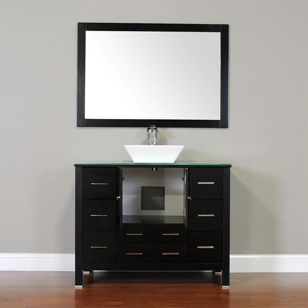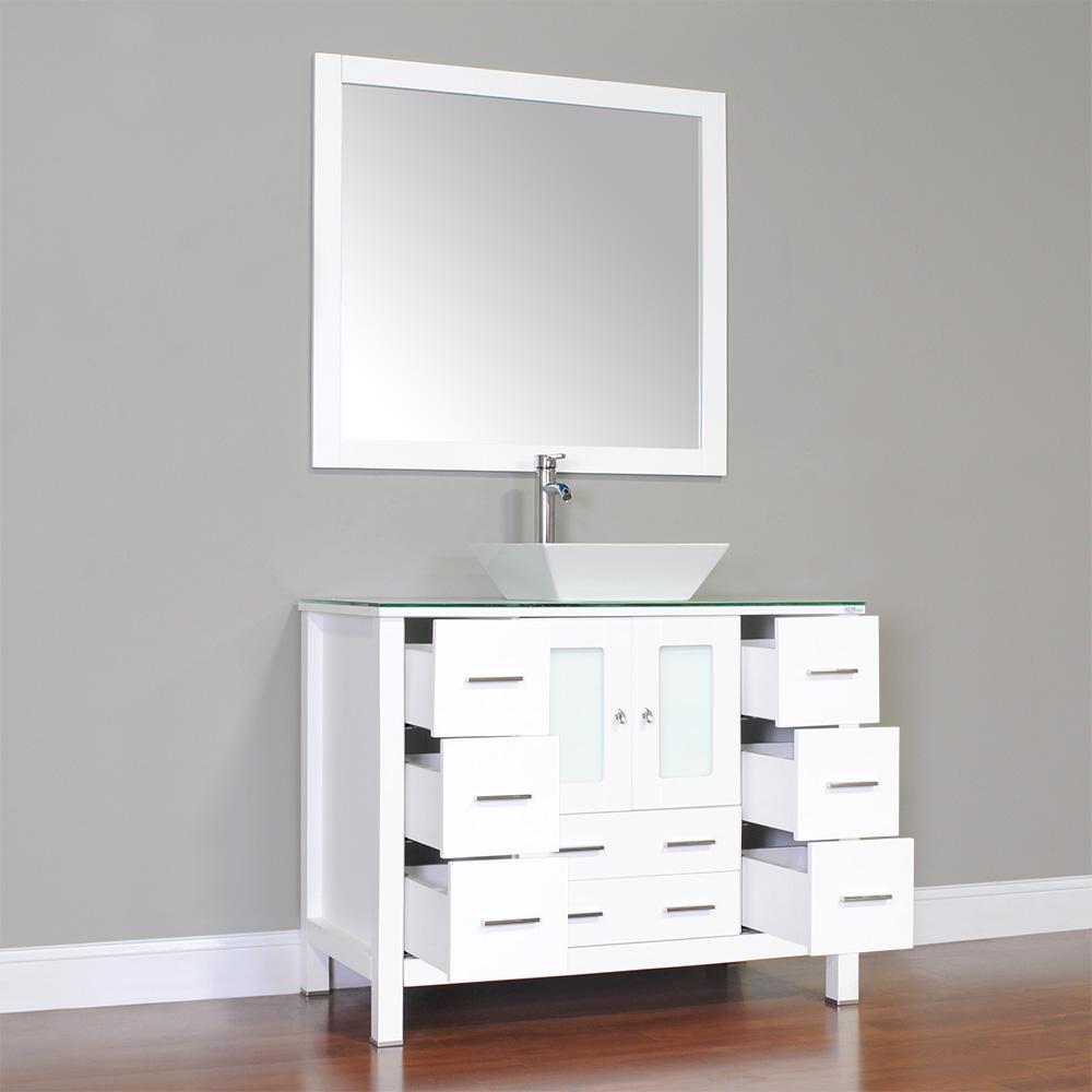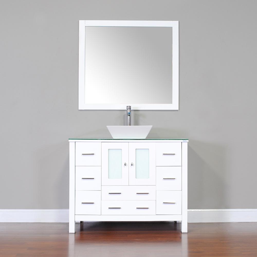 European style and ample space combine elegantly in this 42” single vanity. A solid, tempered safety glass countertop, porcelain square sink and eight fully functional drawers makes this an easy choice for your family – or just for you. With the matching mirror and an additional side cabinet, it’s an ideal candidate for any remodeling project. Available color Black, White.