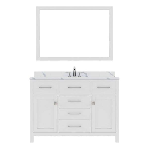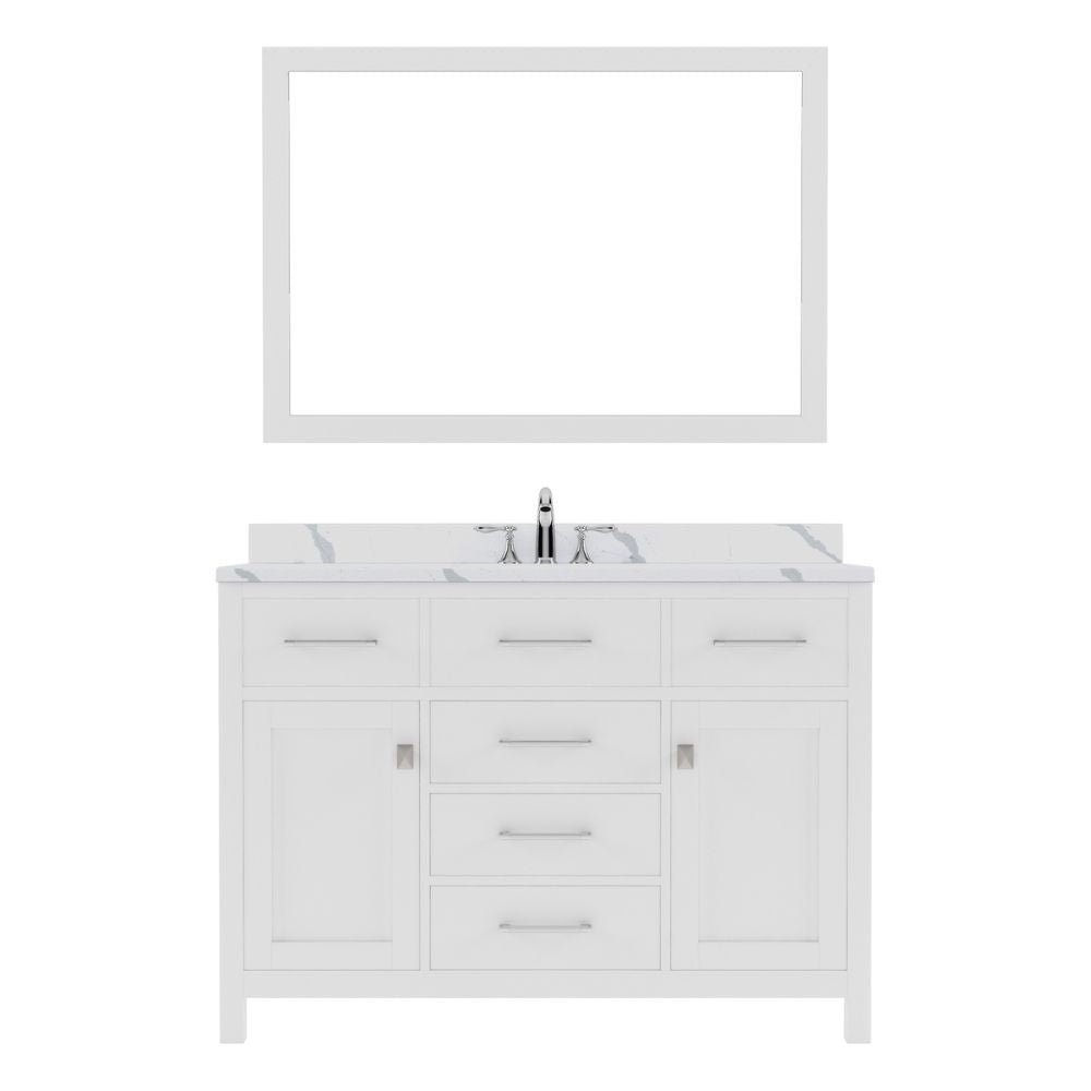 - Includes - 48" White Cabinet, Calacatta Quartz Countertop, 1 Round Undermount Sink, 1 Framed Mirror, 1 Brushed Nickel Faucet