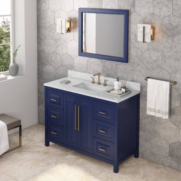 Sleek lines and raised panels come together to create a unique design for the sophisticated Cade vanity collection. Contemporary Stanton pulls in trendy Satin Bronze adorn this Hale Blue vanity, adding elegance and class. Cade's design styles merge to create a perfectly transitional vanity collection. A hardwood dovetail rollout drawer with full-extension soft-close undermount slides is situated underneath the adjustable shelf in the cabinet. Three dovetail drawers provide extra storage space on both sides of the cabinet. Vanity measurements: 48" W x 21-1/2" D x 35" H. This 49" White Carrara Marble vanity top is designed to fit 48" center bowl vanities. White Carrara Marble is a timeless natural stone that creates a neutral clean space. Dark grey veining undulates throughout the stone as it weaves its way across the surface. The center rectangle cutout is sized to fit our undermount rectangle vanity bowl. Three holes are cut for an 8" widespread faucet, and a 4" tall backsplash is included. This vanity top is designed to overhang" on each side and in front of the vanity. Top measurements: 49" W x 22" D x 25 mm H. Backsplash dimensions: 49" W x 25 mm D x 4" H. Some assembly required. Faucet not included.