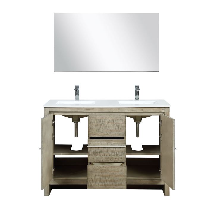Details of the Lafarre 48 Inch Rustic Acacia Double Bathroom Vanity, White Quartz Top, White Square Sink, Labaro Rose Gold Faucet Set, and 43 Inch Frameless Mirror by Lexora | LLF48SKSOSM43FRG