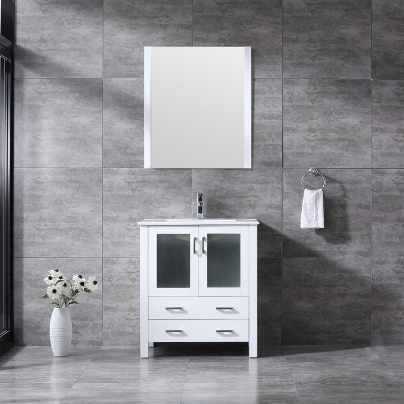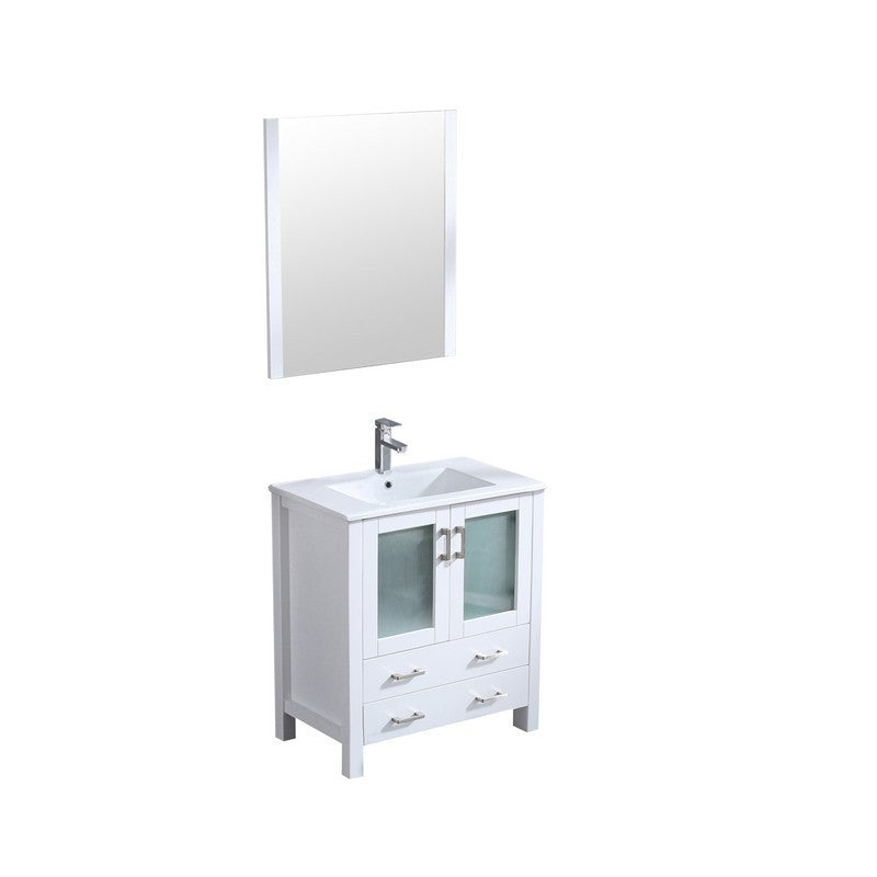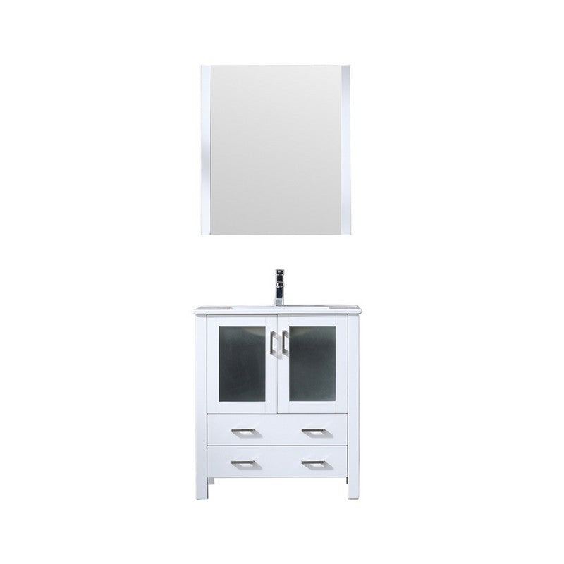 Lexora Volez 30 Inch White Single Vanity, Integrated Top, White Integrated Square Sink and 28 Inch Mirror w/ Faucet | LV341830SAESM28F