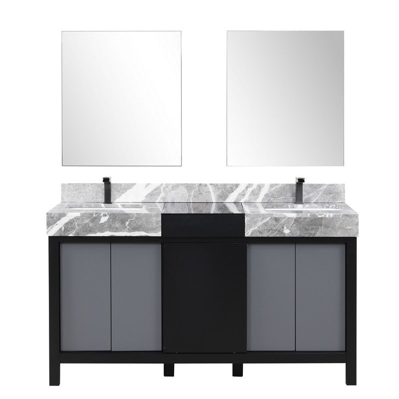 Lexora Zilara 60 Inch Black and Grey Double Vanity, Castle Grey Marble Tops, White Square Sinks, Balzani Gun Metal Faucet Set, and 28 Inch Frameless Mirrors | LZ342260DLISM28FBG