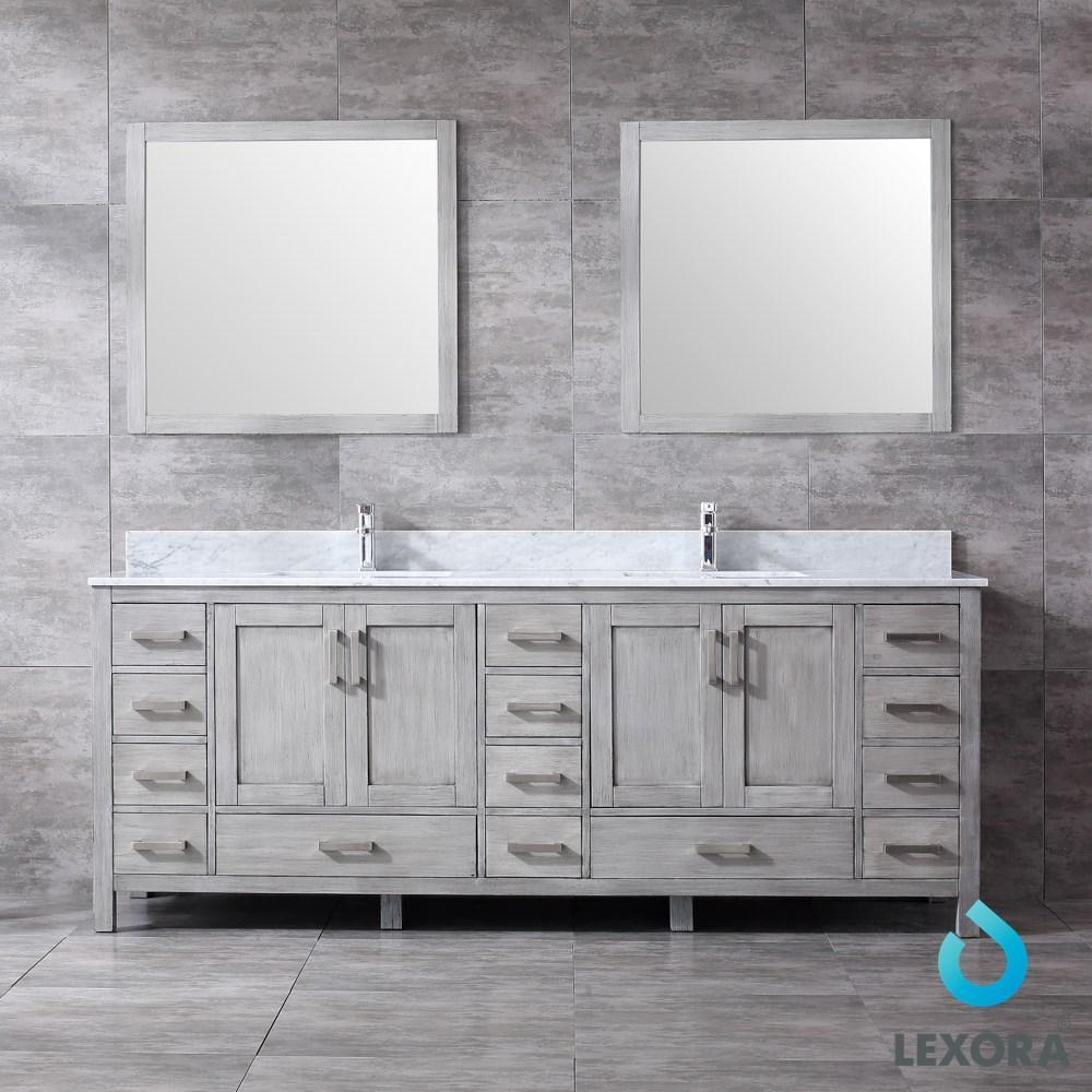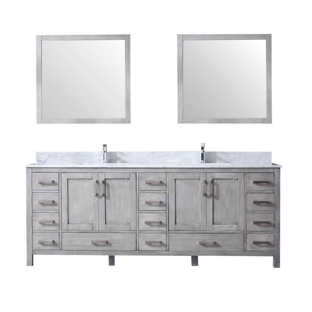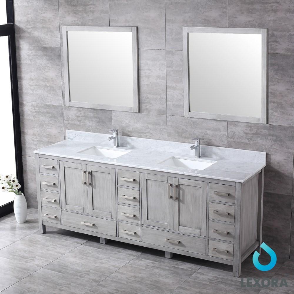 Jacques 84" Distressed Grey Double Vanity | White Carrara Marble Top | White Square Sinks and 34" Mirrors