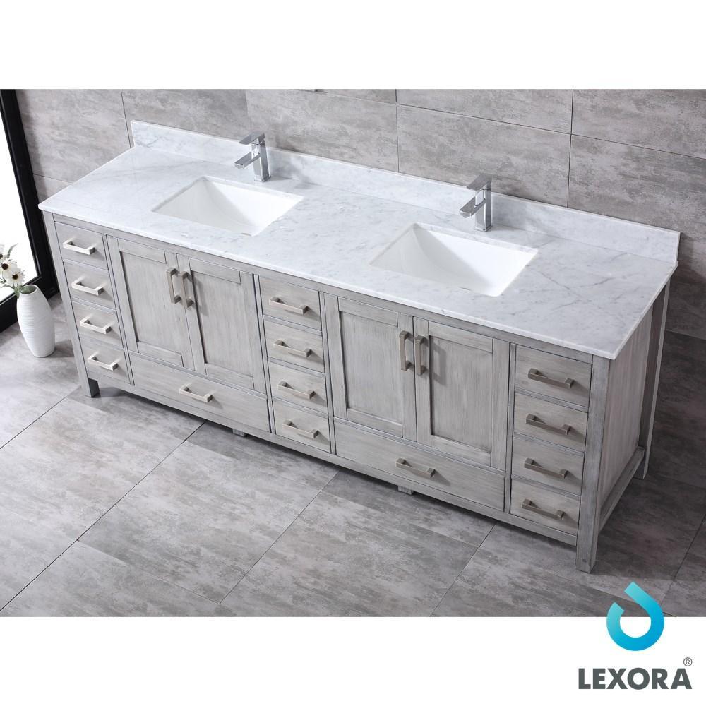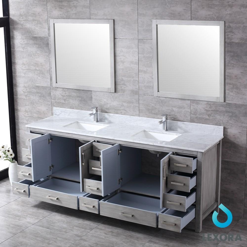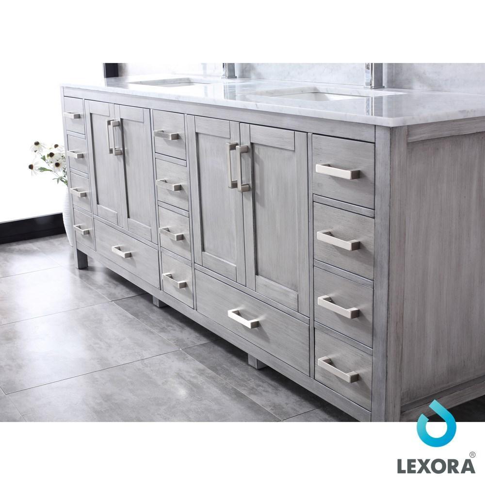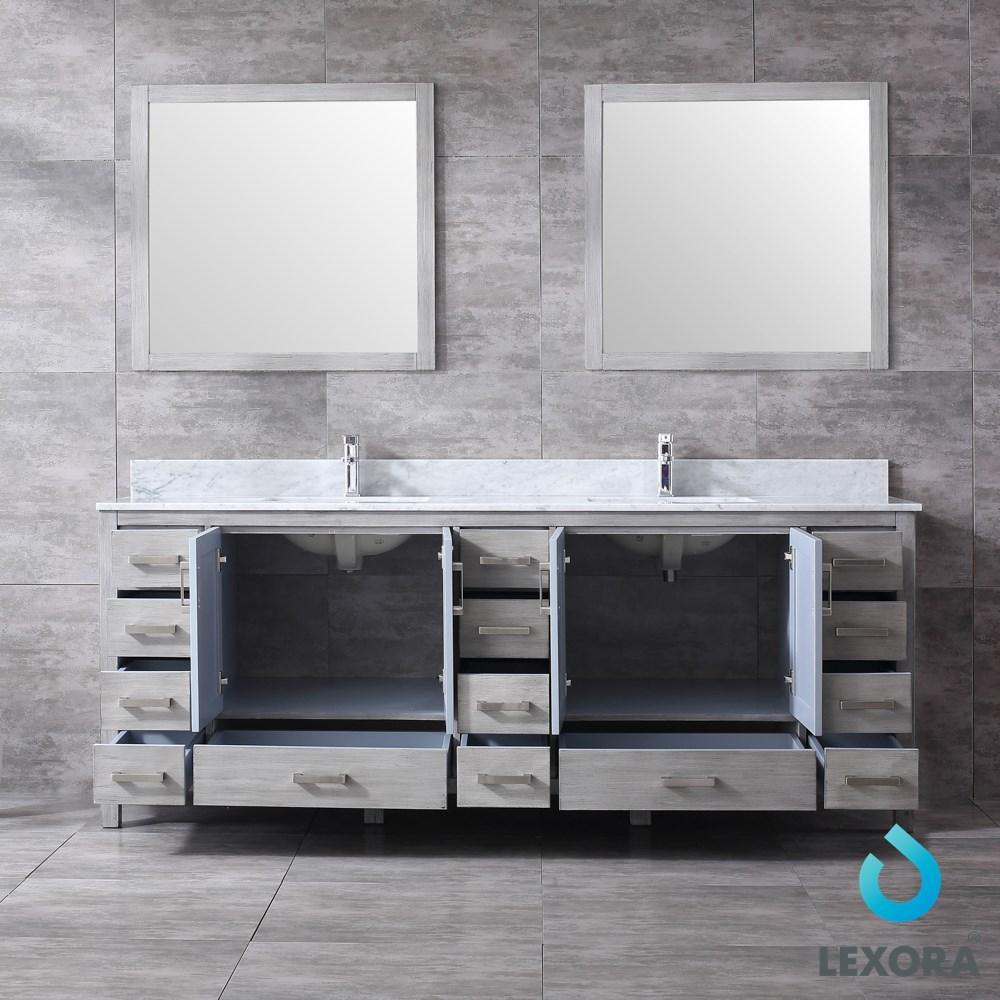 Jacques 84" Distressed Grey Double Vanity | White Carrara Marble Top | White Square Sinks and 34" Mirrors