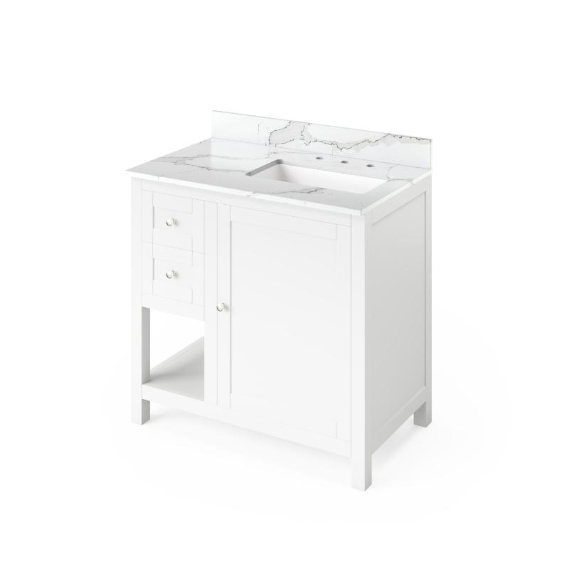 This solid wood Astoria vanity collection features clean lines and a stepped door profile for a modern look. This soft White unit is adorned with Elements Slade knobs in Satin Nickel which complement the style. The 36" unit features an offset drawer bank with two additional dovetail drawers and an open bottom shelf. A hardwood dovetail rollout drawer with full-extension soft-close undermount slides is situated underneath the adjustable shelf in the large cabinet. This vanity Vanity measurements: 36" W x 21-1/2" D x 35" H. This 37" Calacatta Vienna Quartz vanity top is designed to fit 36" right offset vanities. This quintessential quartz pattern showcases the flow of refined veining throughout the white core. The wide veining ranges in color from cool ash to warm shale and can be tinged with secondary deep gray striations. Calacatta Vienna Quartz is designed to mimic the movement of natural stone while possessing the strength and durability of quartz. The right offset rectangle cutout is sized to fit our undermount rectangle vanity bowl. Three holes are cut for an 8" widespread faucet, and a 4" tall backsplash is included. This vanity top is designed to overhang on each side and in front of the vanity. Top measurements: 37" W x 22" D x 18 mm H. Backsplash dimensions: 37" W x 18 mm D x 4" H.Some assembly required. Faucet not included.