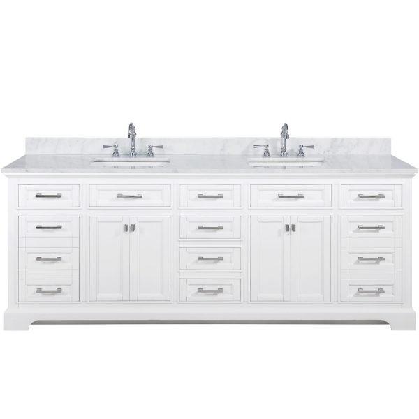Combining classic charms with modern features, the elegant Milano Vanity Collection by Design Element will instantly transform your bathroom into a work of art. All Milano vanity cabinets are constructed from solid birch hardwood and manufactured wood panels and paired with a 1-inch thick seamless white Quartz with gray veins countertop and backsplash from Italy that are cut from a single slab. Soft closing doors and drawers provide smooth and quiet operations, while brushed finished metal hardware provides the perfect finishing touch. Other fine details include white porcelain sinks with overflow, dovetail joint drawer construction, predrilled holes to accommodate 8-inch widespread faucets, and multi-layer paint finish on the cabinets provide beauty and durability for years to come.