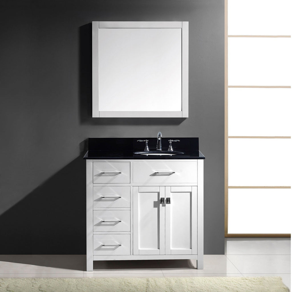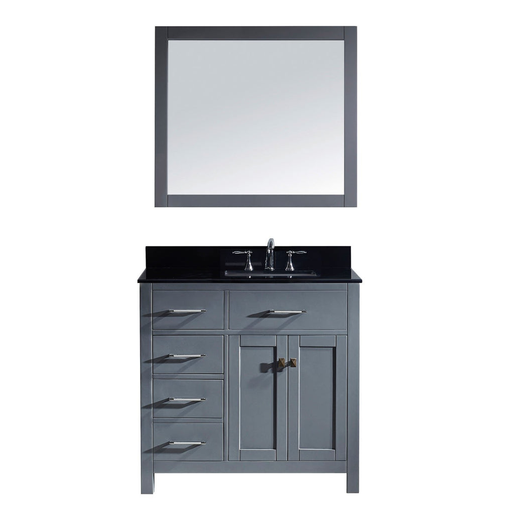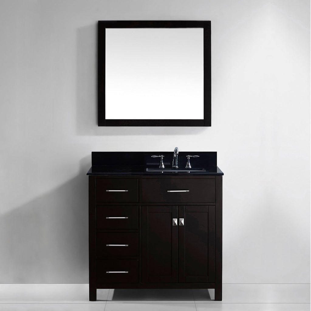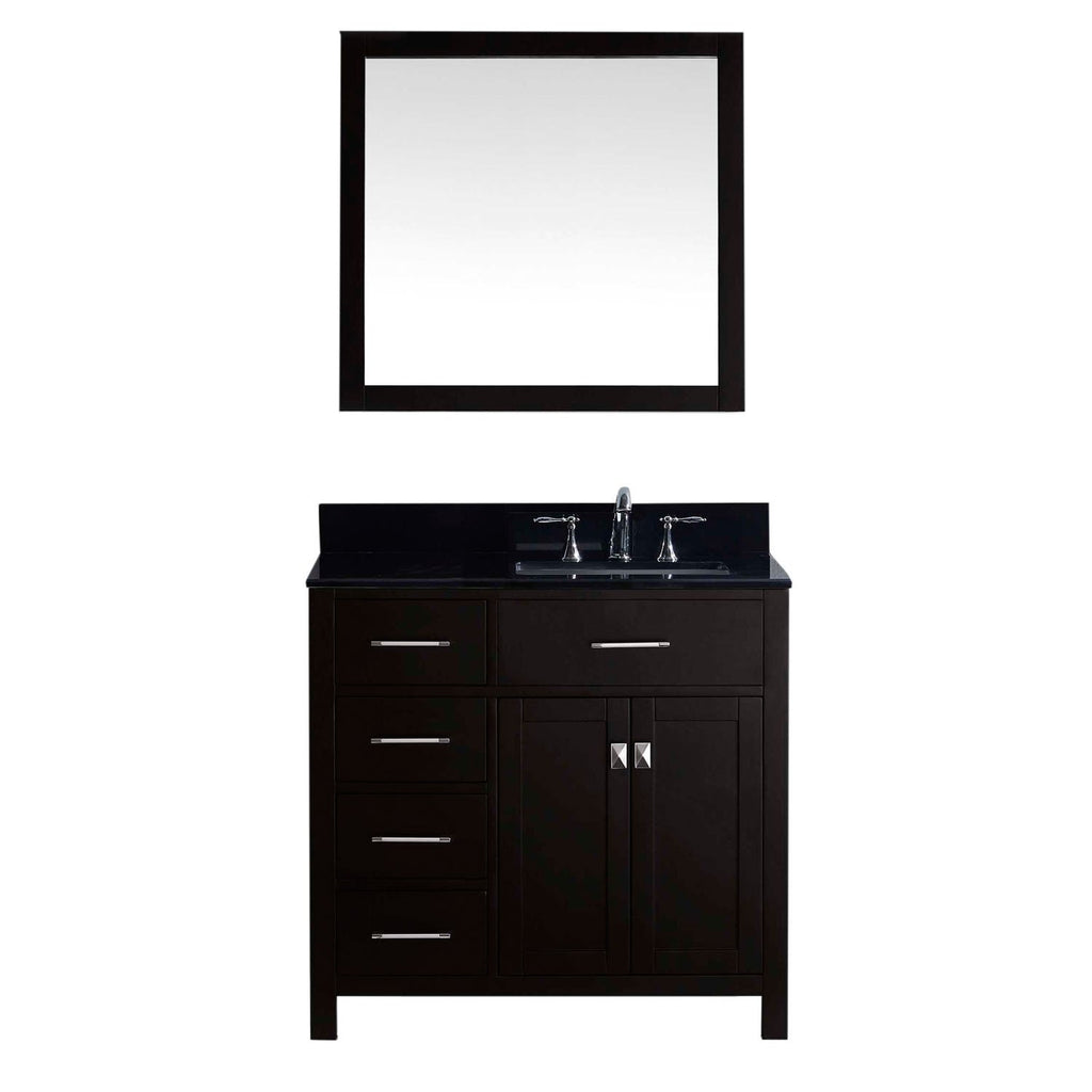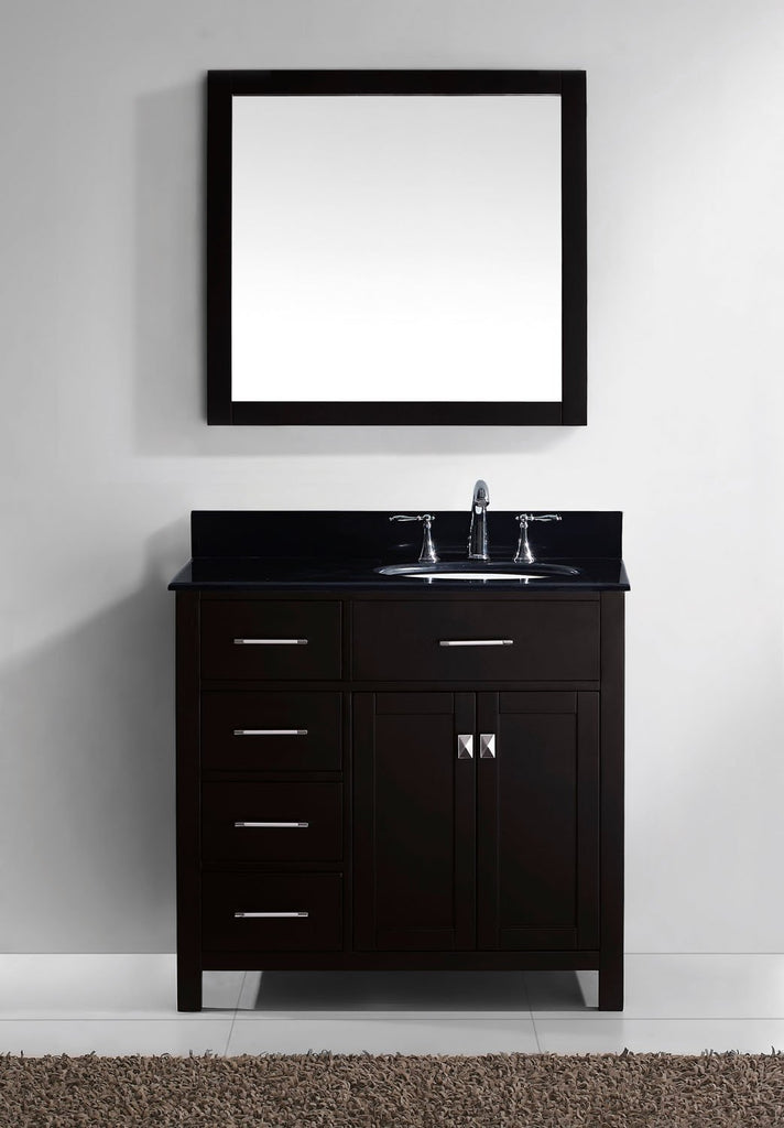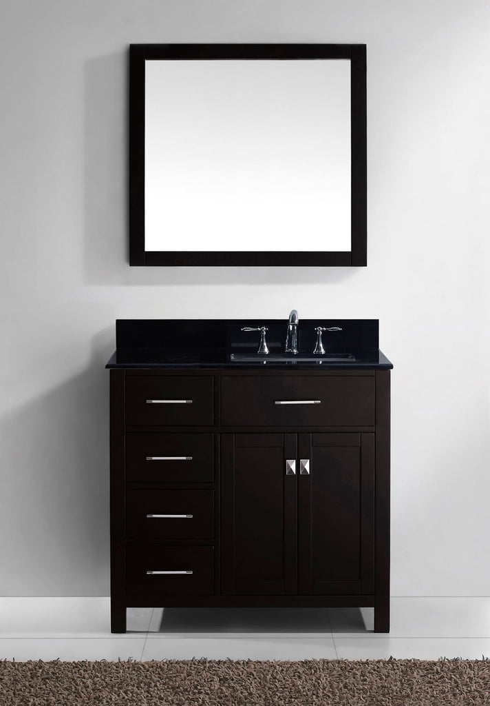 Details of the Caroline Parkway 36" Single Bathroom Vanity in Espresso with Black Galaxy Granite Top and Round Sink with Mirror