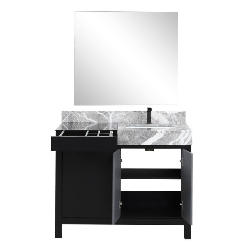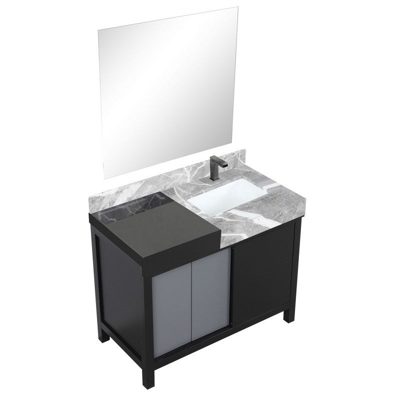 Lexora Zilara 42 Inch Black and Grey Vanity, Castle Grey Marble Top, White Square Sink, Balzani Gun Metal Faucet Set, and 30 Inch Frameless Mirror | LZ342242SLISM34FBG