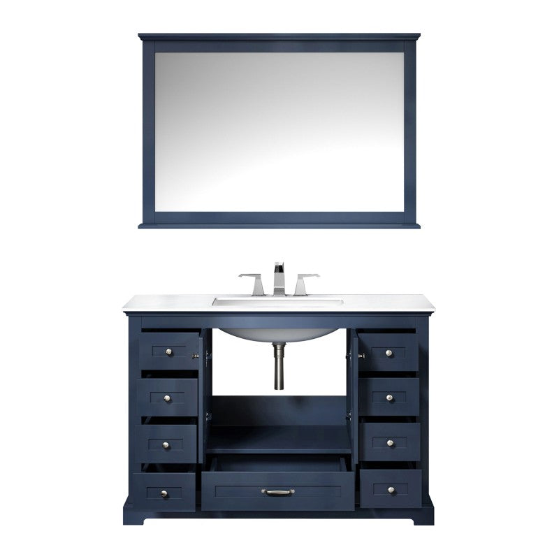 Details of the Dukes 48 Inch Navy Blue Single Vanity, White Quartz Top, White Square Sink and 46 Inch Mirror by Lexora | LD342248SEWQM46