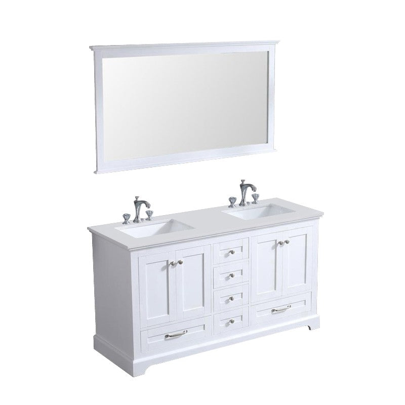 Details of the Dukes 60 Inch White Double Vanity, White Quartz Top, White Square Sinks and 58 Inch Mirror by Lexora | LD342260DAWQM58