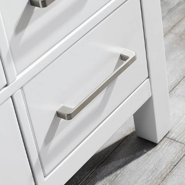 A perfect complement to a contemporary space, the Vinnova Gela Vanity combines the clean, sharp lines of modern design with classic furniture styling. The Carrara White marble countertop provides a dramatic contrast with the cabinet. Simple, bar-style pulls and knobs adorn the spacious drawers and doors, which conceal ample storage space for all your bathroom accouterments.
