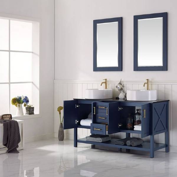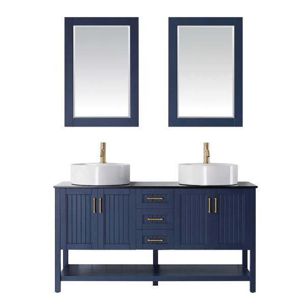 Modena 60 Inch Double Vanity in Royal Blue with Glass Countertop with White Vessel Sink With Mirror by Vinnova
