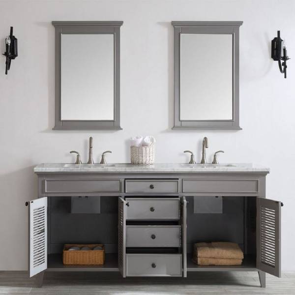 Evocative of West Indies style, the Piedmont Vanity collection brings refined simplicity to your bathroom space. Louvered doors add character and distinction to this intriguing piece, which is topped with a countertop made of sculpture-quality white Cararra marble. Featuring generous cabinet room, the Piedmont is as practical as it is stunning. Available in Antique White, Grey, or Cherry finish to coordinate perfectly with your tastes and home décor.