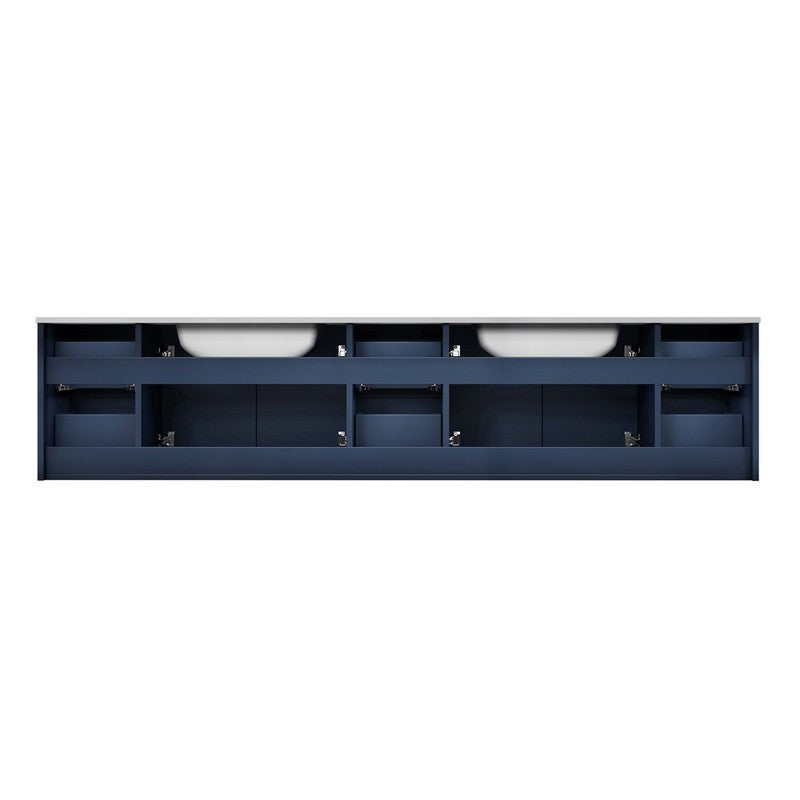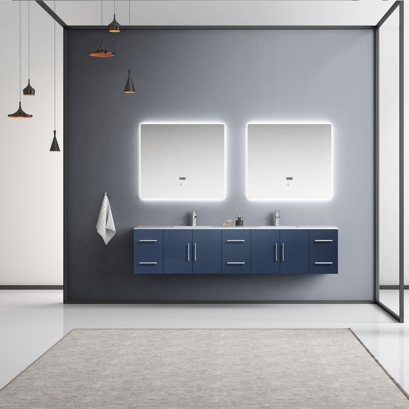 The wall-mounted Geneva vanity ensemble in navy blue from Lexora is a beautiful blending of postmodern style and sensible functionality. Its simple, box-like design is complemented by a marble countertop that lends hints of classical style. When mounted on the wall, the Geneva vanity leaves ample space beneath for additional storage—ideal for bathrooms with limited space. Also available in other colors, you can easily match this vanity to any bathroom décor. And, with a pair of undermount sinks, faucets, drains, p-traps and with premium LED mirror(s), this piece is all you need to give your bathroom a total makeover.