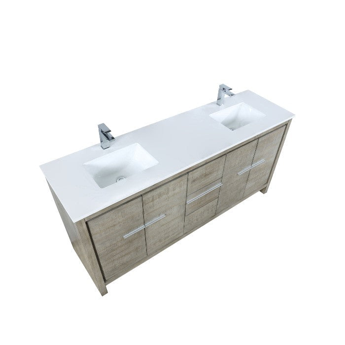 Details of the Lafarre 72" Rustic Acacia Double Bathroom Vanity, White Quartz Top, White Square Sinks, and Labaro Rose Gold Faucet Set by Lexora | LLF72DKSOD000FRG