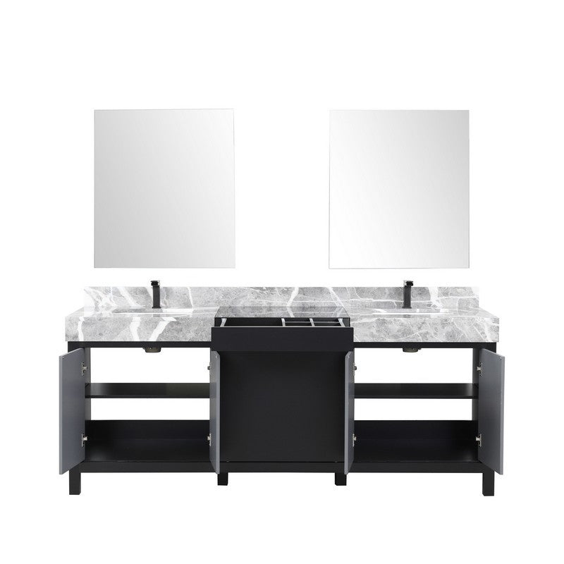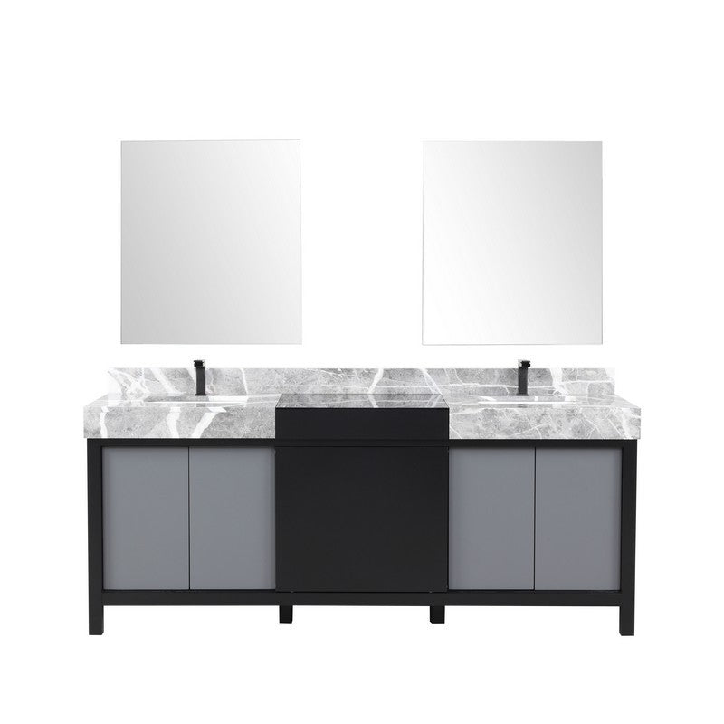 Lexora Zilara 80 Inch Black and Grey Double Vanity, Castle Grey Marble Tops, White Square Sinks, Balzani Gun Metal Faucet Set, and 30 Inch Frameless Mirrors | LZ342280DLISM30FBG