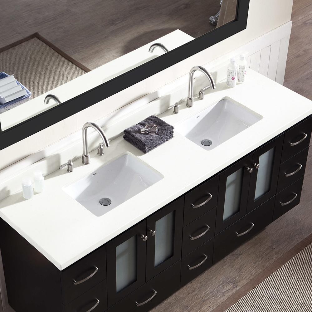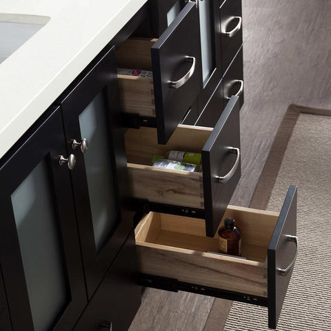 Modernize your bathroom remodel with an Americano bathroom vanity from Ariel Bath. These black bathroom vanities are a chic choice, complete with satin nickel finish hardware and soft-closing dovetail drawers. Ceramic, under-mount sinks with space for a widespread faucet finish out the pure white countertops.