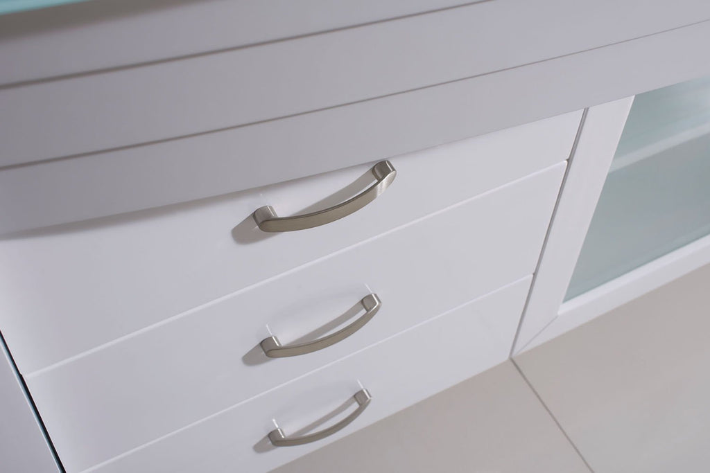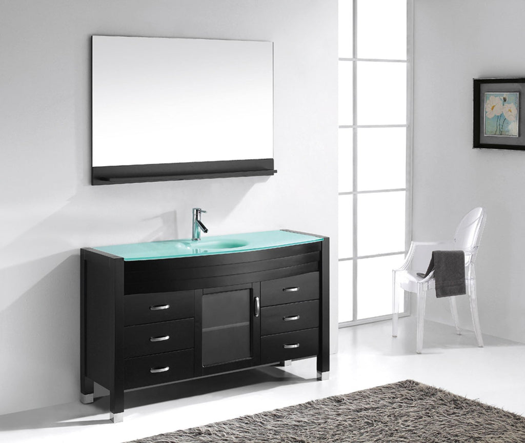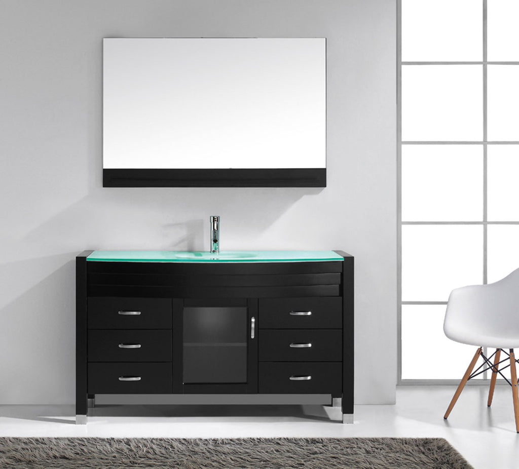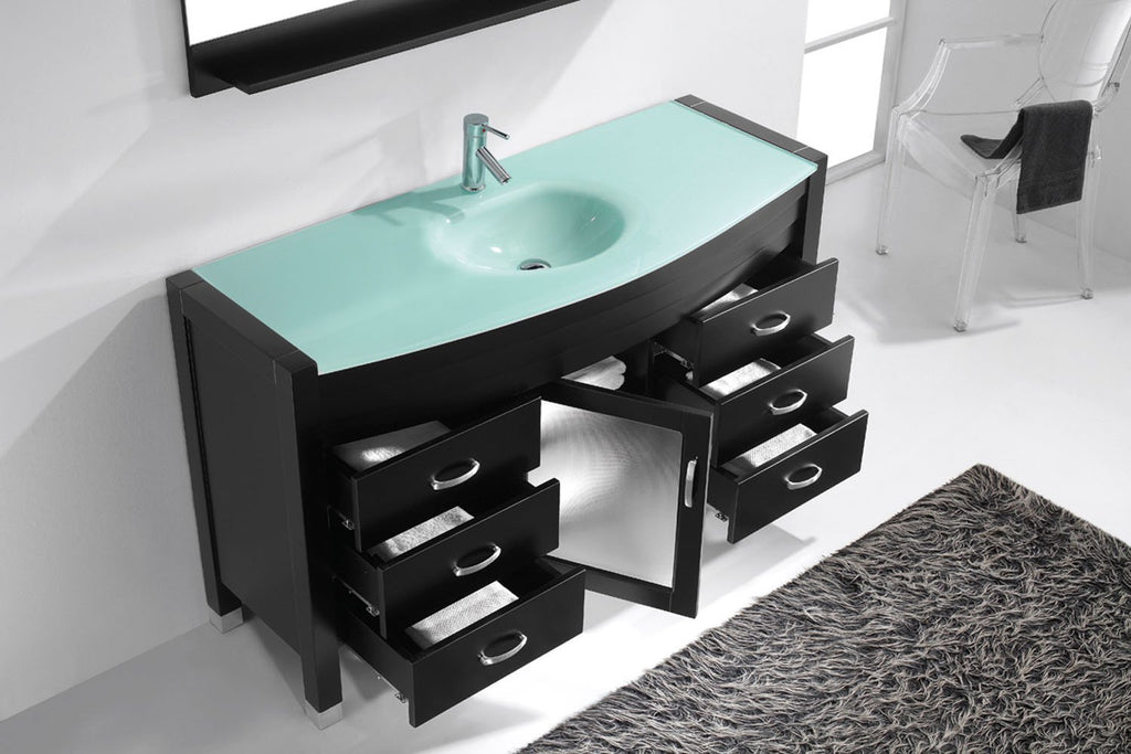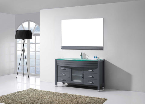 The Ava vanity offers modern clean-lined sophistication and classic warmth. The vanity is constructed from solid oak wood. Glass inserts add character and nice look to his and her cabinet doors. Never hear a door slam again with the included soft closing hinges. The vanity is finished with the contemporary-rich Espresso color and is available with glass or stone countertop options. The vanity set comes complete with a matching mirror and equipped with eco-friendly, lifetime warranty faucets. The Ava vanity is a center piece to any bathroom design. Virtu USA has taken the initiative in changing the vanity industry by adding soft closing doors and drawers to their entire product line. The premium soft-closing hardware not only increases the safety of the vanity, but also its lifetime reliability. Available color Espresso, Grey, White