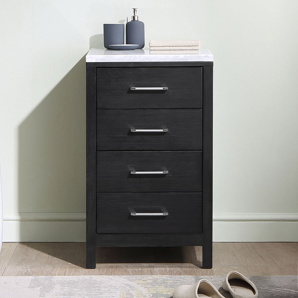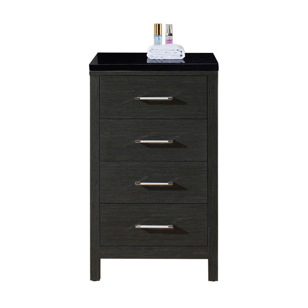 Inspired by the Caroline Parkway, the Caroline Avenue side cabinet offers a clean sleek structure with abundant storage. The vanity is constructed from the finest plywood with a premium grade of the zebra grey veneer finish. The Caroline Avenue also features a black galaxy granite top. This striking side cabinet will be a great centerpiece to any bathroom or home design. Virtu USA has taken the initiative in changing the vanity industry by adding soft closing doors and drawers to their entire product line. The premium soft-closing hardware not only increases the safety of the vanity, but also its lifetime reliability. Black Galaxy Granite Countertop , White Stone, White Marble.