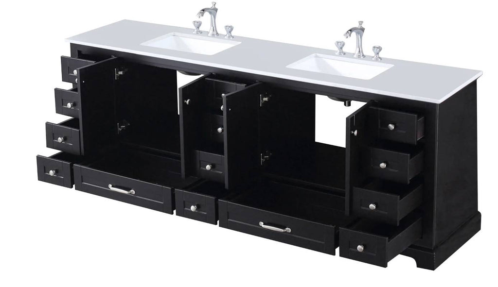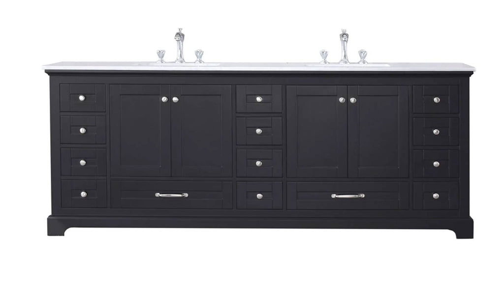 Details of the Dukes 84 Inch Espresso Double Vanity, White Quartz Top, White Square Sinks and no Mirror by Lexora | LD342284DGWQ000
