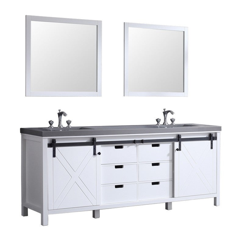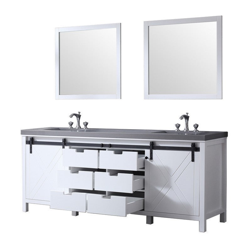 Lexora Marsyas 84 Inch White Double Vanity, Grey Quartz Top, White Square Sinks and 34 Inch Mirrors w/ Faucets | LM342284DAASM34F