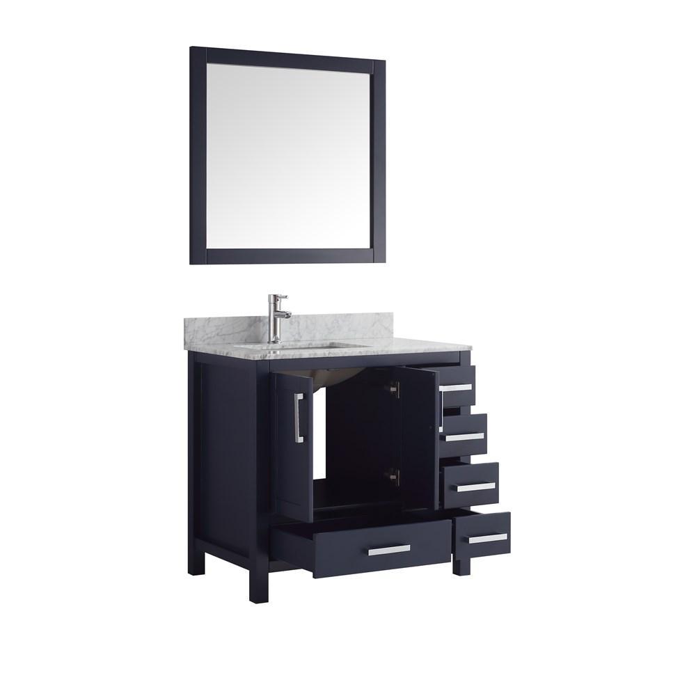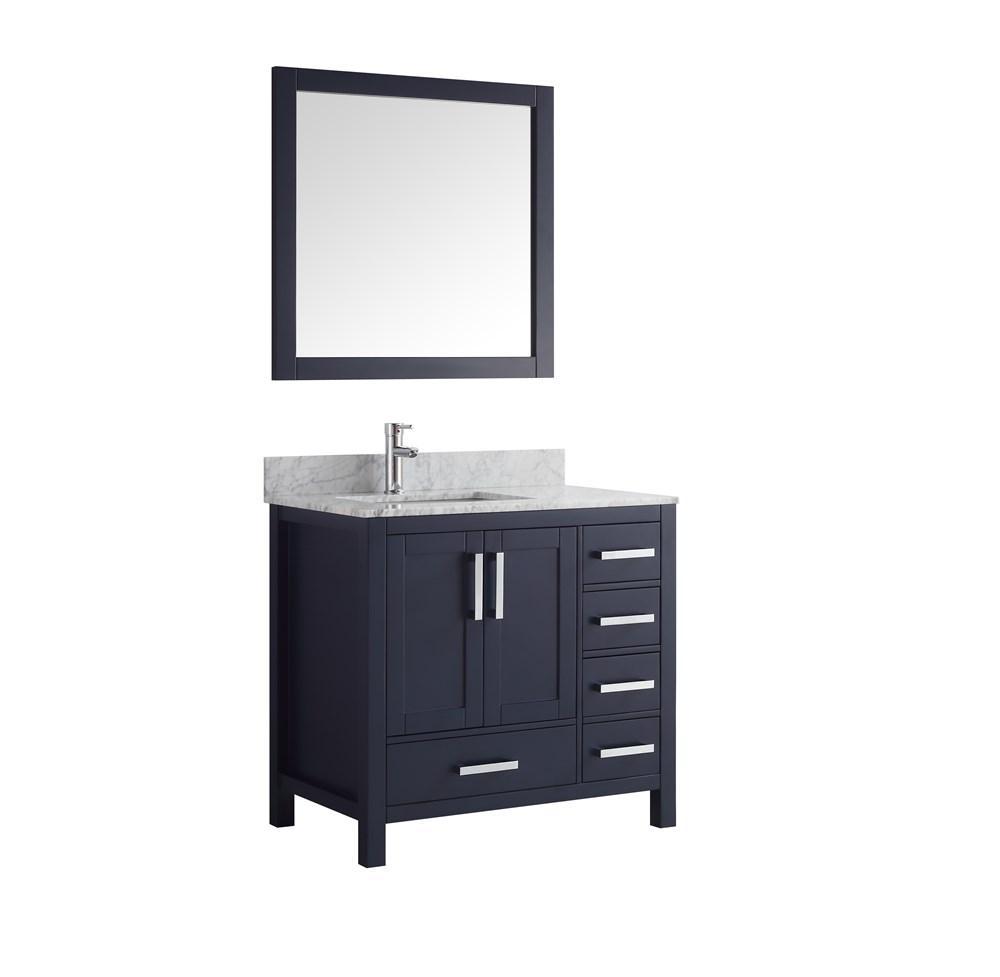 Jacques 36" Navy Blue Single Vanity | White Carrara Marble Top | White Square Sink and 34" Mirror - Left Version