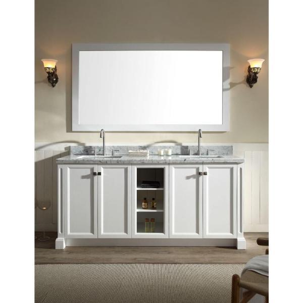 Decorate your bathroom today with a contemporary Westwood bathroom vanity from ARIEL. This bathroom vanity series features solid wood cabinets with carrara white marble countertops. The soft-closing doors include adjustable hinges and satin nickel finish hardware, and the uncovered open shelves allow you to display your accessories and personalize your bathroom decor.