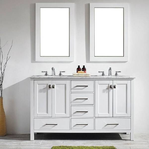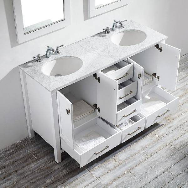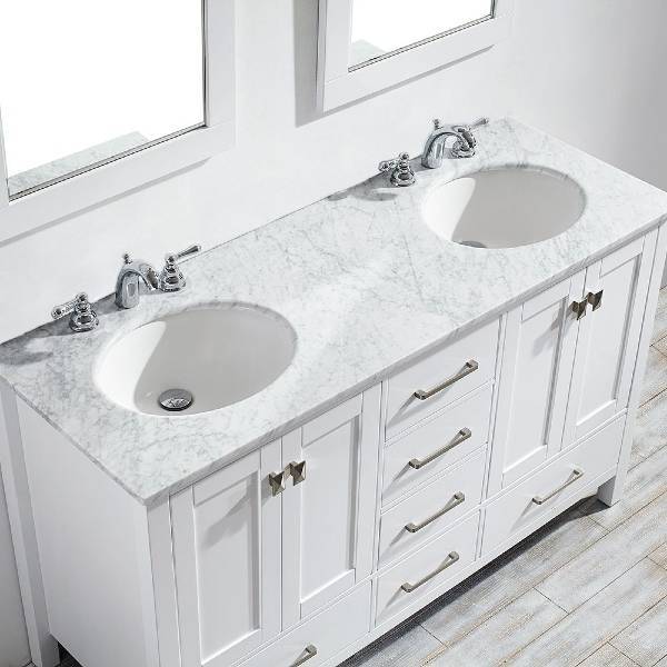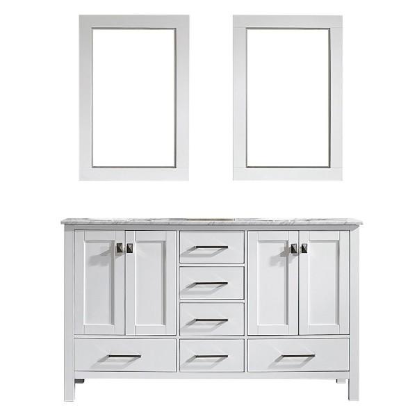 Gela 60" Double Vanity in White with Carrara White Marble Countertop With Mirror by Vinnova