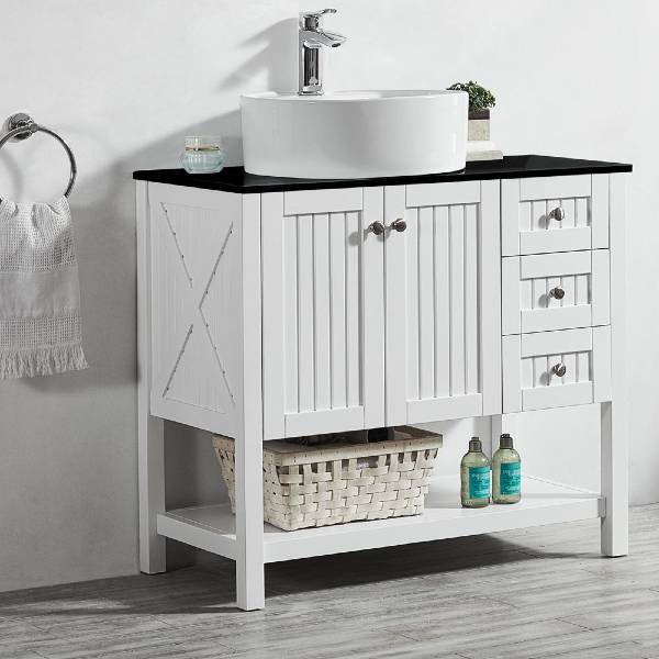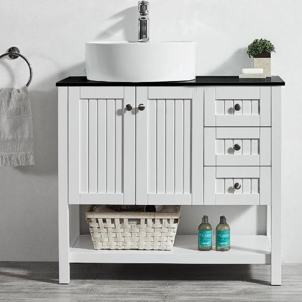 Modena 36” Vanity in White with Glass Countertop with White Vessel Sink Without Mirror by Vinnova