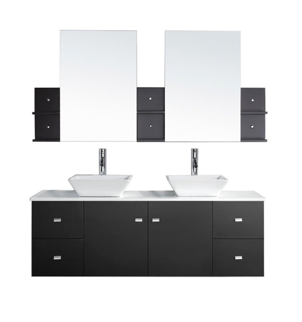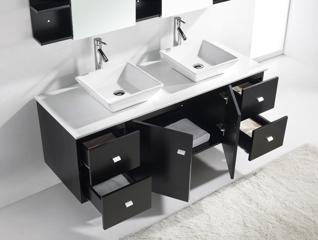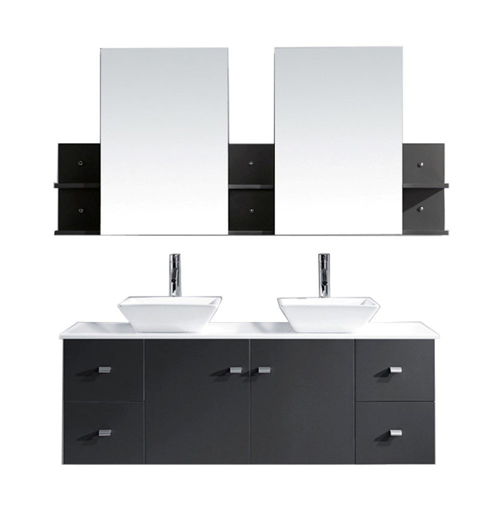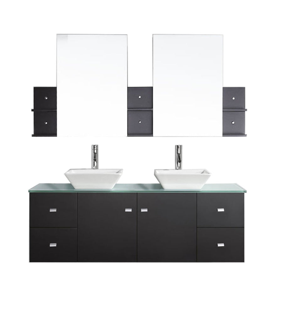 The Clarissa is truly a magnificent vanity, uniquely designed with the latest modern bathroom style. It is constructed from high quality solid oak wood and finished with Espresso color. The Clarissa vanity features the options of white artificial stone or tempered glass countertop. Beautiful ceramic sinks triumph and further enhance the design. The Clarissa offers significant storage including medicine mirror cabinets with wall shelves. Better yet, with this vanity set there is included eco-friendly and lifetime warranty faucets. This Clarissa vanity set will amplify any bathroom design. Virtu USA has taken the initiative in changing the vanity industry by adding soft closing doors and drawers to their entire product line. The premium soft-closing hardware not only increases the safety of the vanity, but also its lifetime reliability. Available color Espresso, Grey, White. Glass and Stone top.