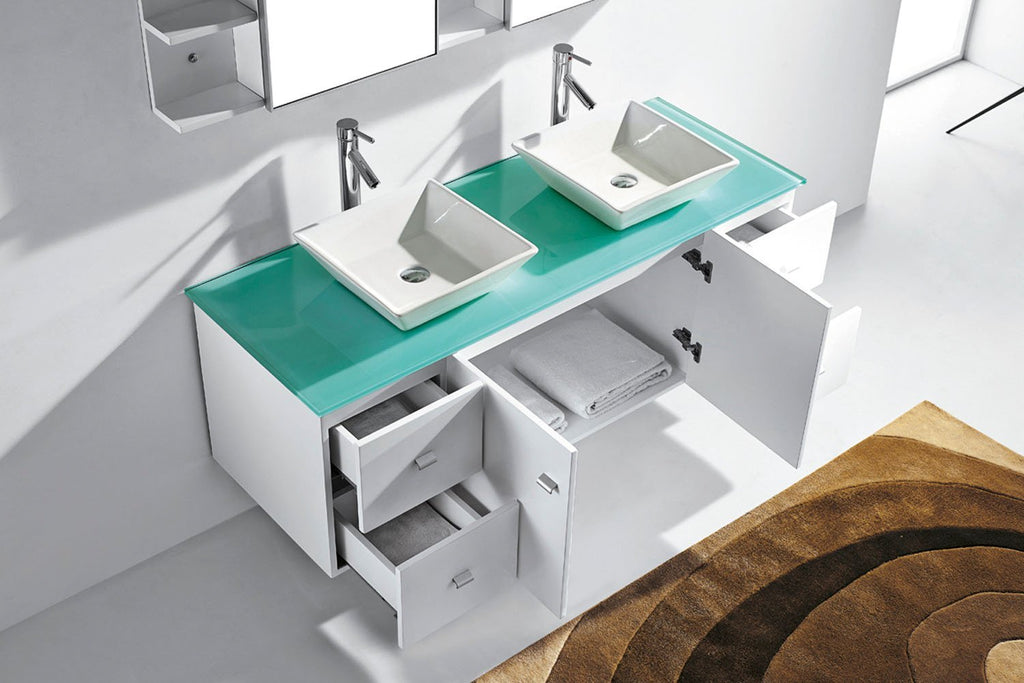 Details of the Virtu USA Clarissa 61" Double Bathroom Vanity with Aqua Tempered Glass Top and Square Sink