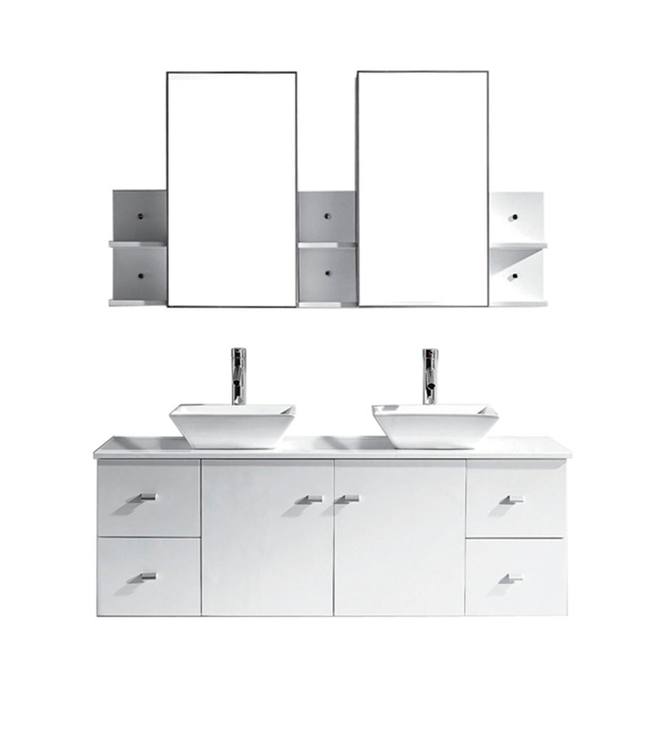 - Included: (1) Cabinet, (1) Top, (2) Mirrors, (2) Basins, (2) Faucets