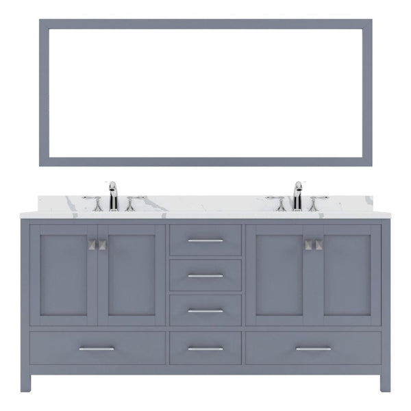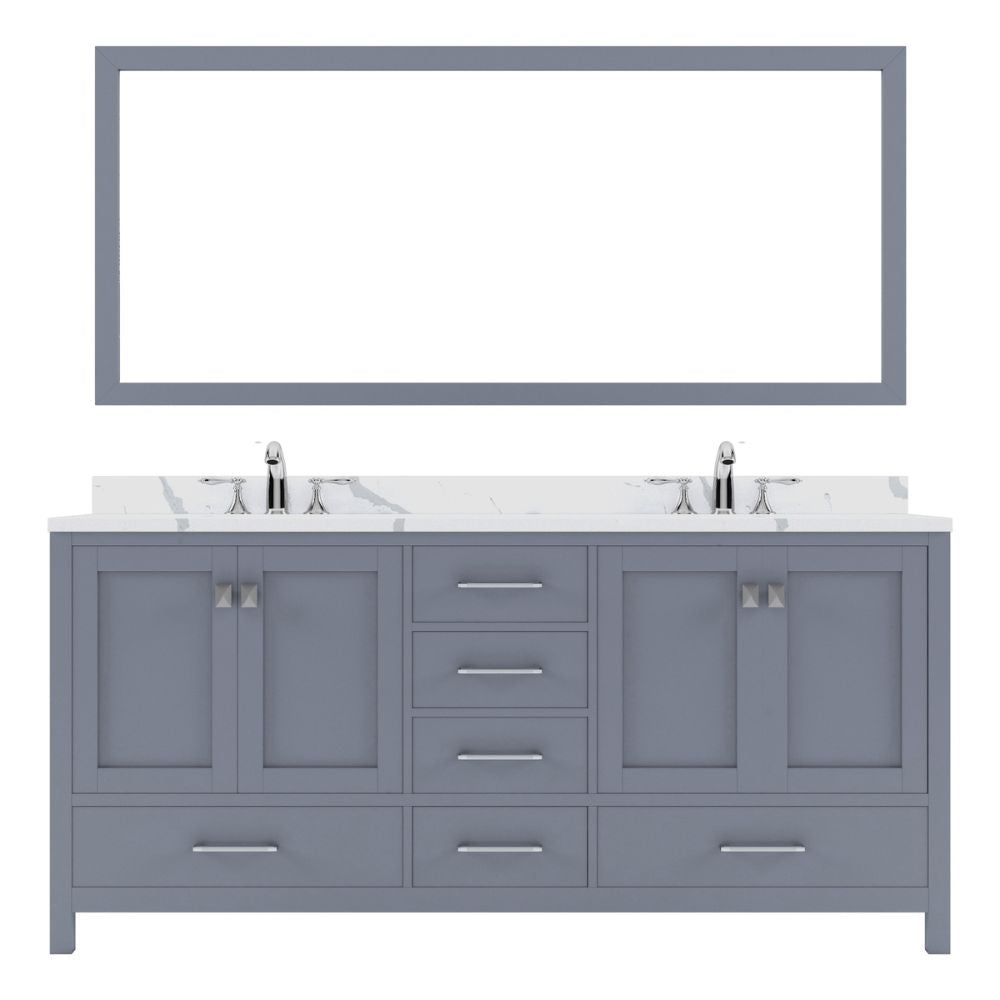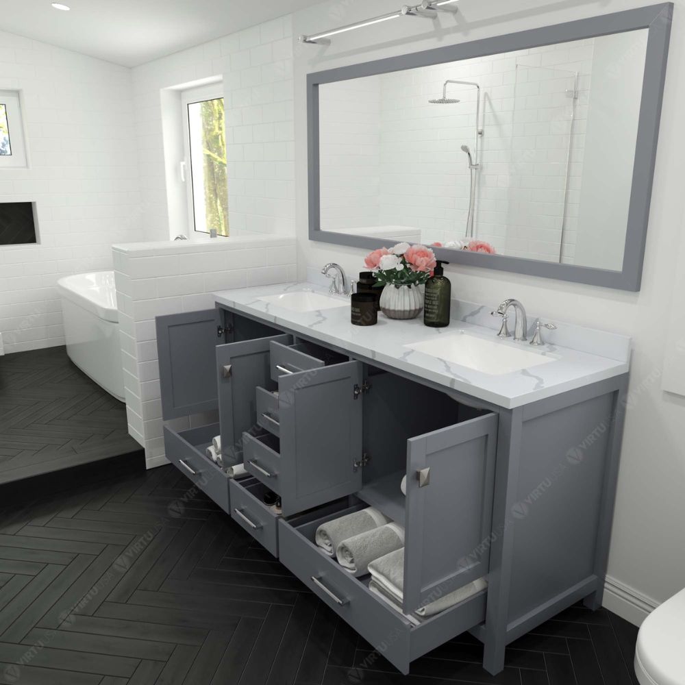 - Includes - 72" Gray Cabinet, Calacatta Quartz Countertop, 2 Square Undermount Sinks, 1 Framed Mirror, 2 Brushed Nickel Faucets
