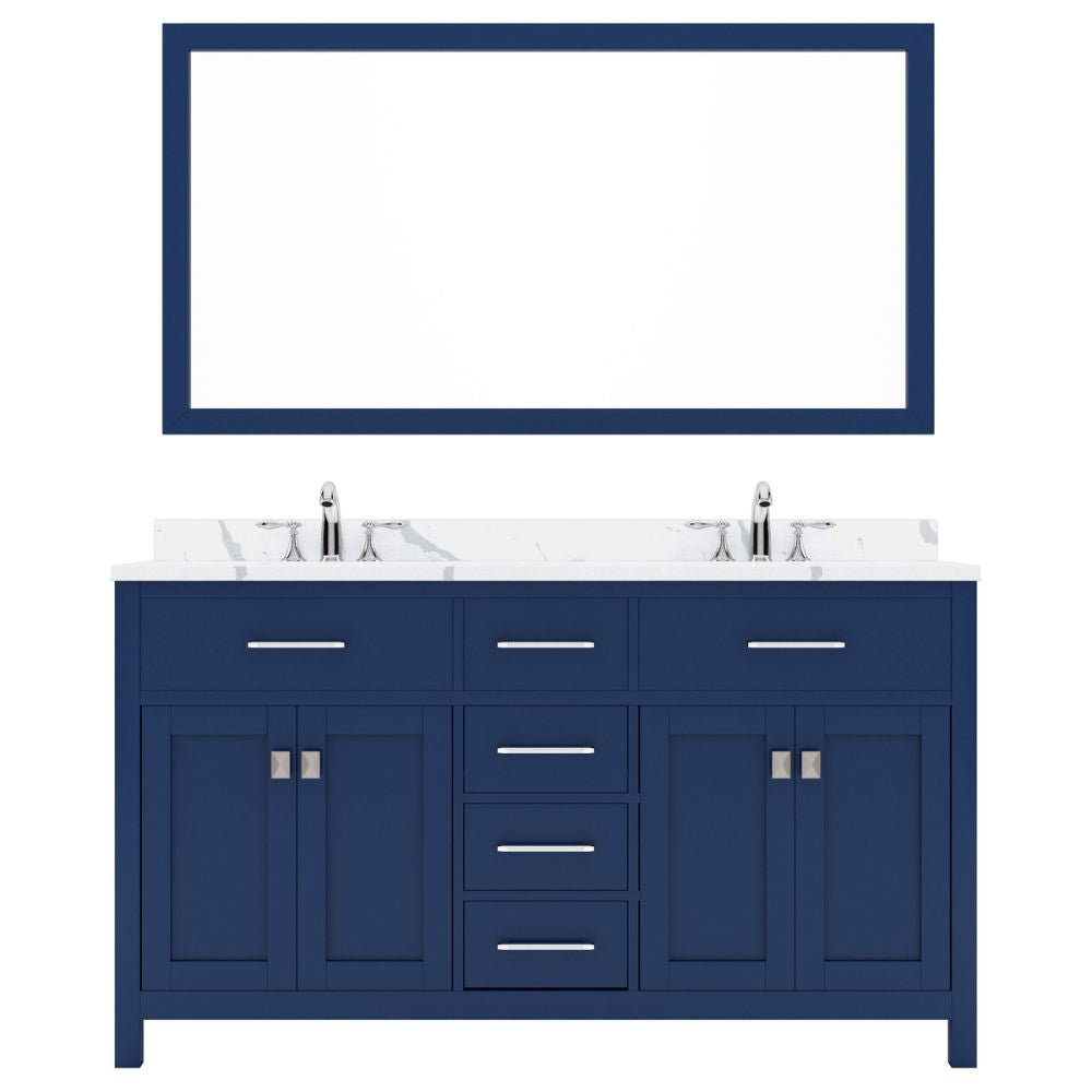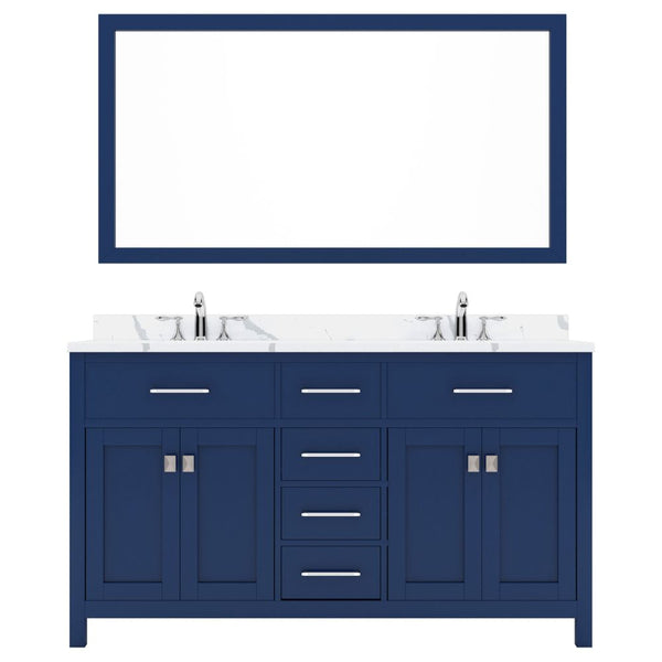 - Includes - 60" French Blue Cabinet, Calacatta Quartz Countertop, 2 Round Undermount Sinks, 1 Framed Mirror, 2 Brushed Nickel Faucets