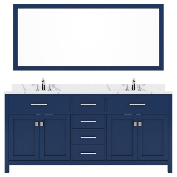 • Includes - 72" French Blue Cabinet, Calacatta Quartz Countertop, 2 Round Undermount Sinks, 1 Framed Mirror, 2 Brushed Nickel Faucets
