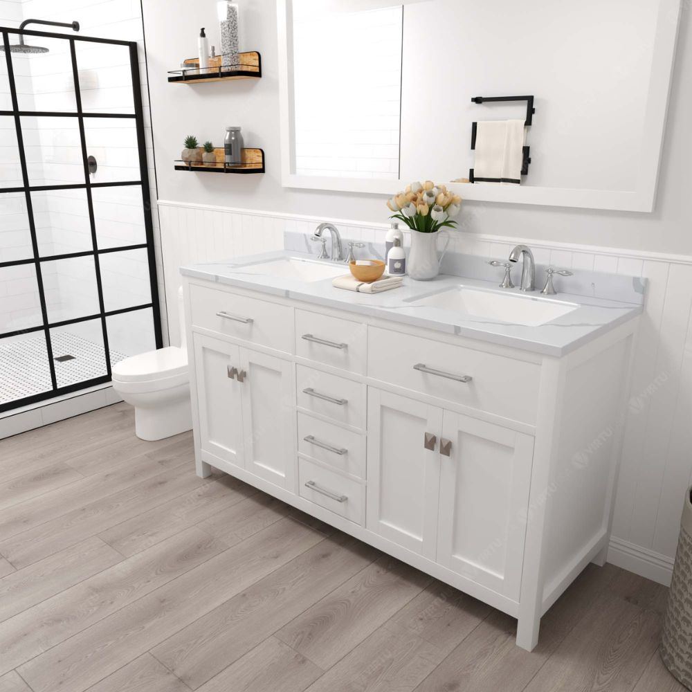 - Includes - 60" White Cabinet, Calacatta Quartz Countertop, 2 Square Undermount Sinks