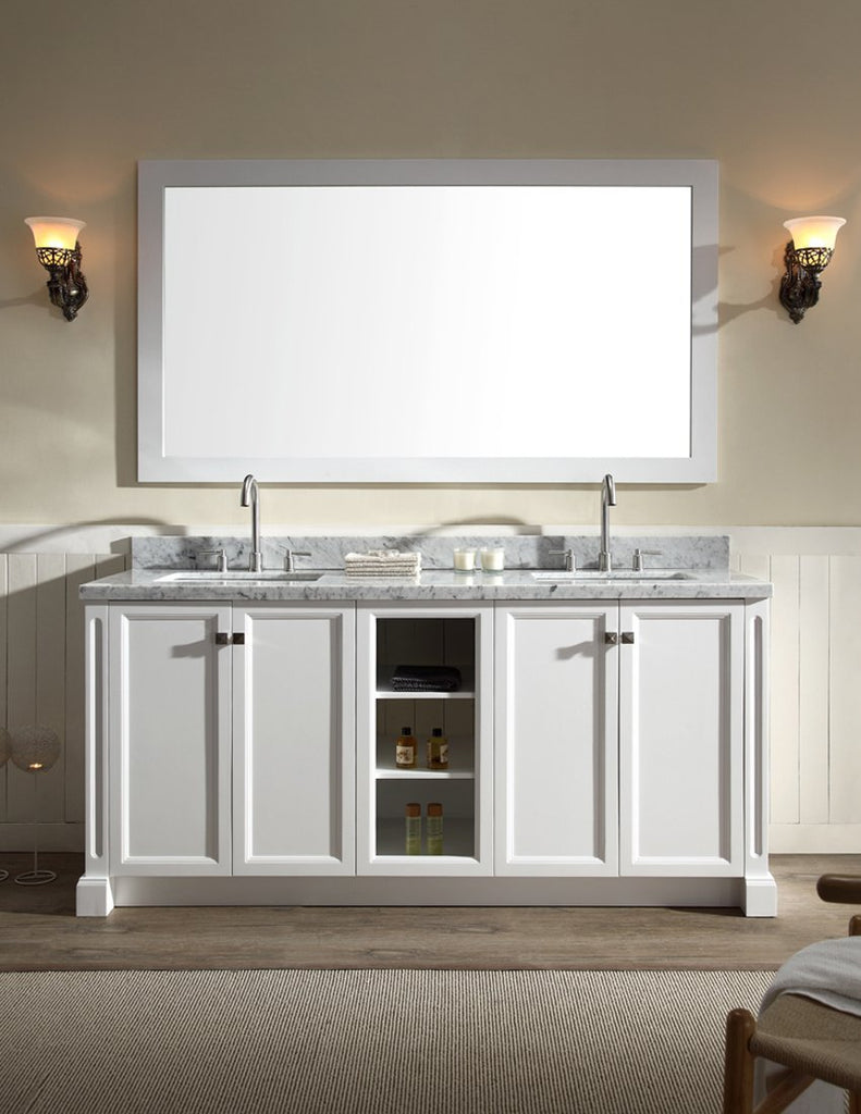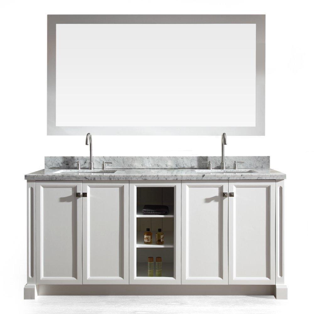 Decorate your bathroom today with a contemporary Westwood bathroom vanity from Ariel Bath. This bathroom vanity series features white, solid wood cabinets with carrara white marble countertops. The soft-closing doors include adjustable hinges and satin nickel finish hardware, and the uncovered open shelves allow you to display your accessories and personalize your bathroom decor.