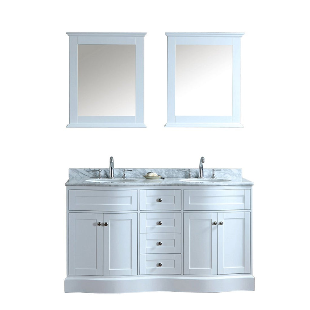 Drawing design cues from traditional Hampton architecture, this vanity from our Montauk collection embodies a timeless and classic shape, with softly-rounded edges and an abundance of drawers and doors for maximum storage. The white carrera marble countertop features an premium OGEE edge, which further compliments the contours on this timeless design. Four doors with soft-closing hinges Four drawers with soft-closing sliders White carrera marble countertop w/matching backsplash design. All marble tops are finished by hand, pre-drilled for all 8" widespread faucets, and double-sealed for scratch-resistance and long-term durability 2 cUPC-certified oval undermount sinks Color: Alpine White 2 Matching wood-framed 34.6"W x 35.4"H mirrors included Vanity Dimensions: 60"L x 22"W x 34.6"H