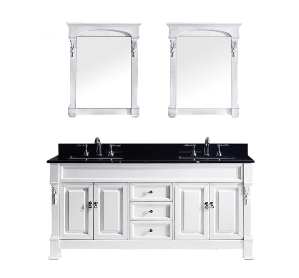 Details of the Huntshire 72" Double Bathroom Vanity in White with Black Galaxy Granite Top and Square Sink with Mirrors
