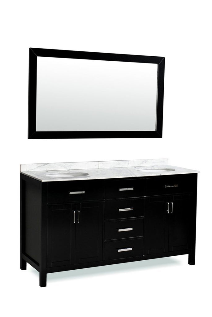 Elegant simplicity and a deep Espresso finish keynote the versatile Hampton double sink vanity. The counter top is made from high quality heat and scratch resistant Carrera natural marble. Clean lines and square shapes are accented by the luxurious modern handles that make the Hampton a perfect addition to your bathroom décor.