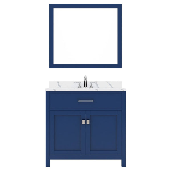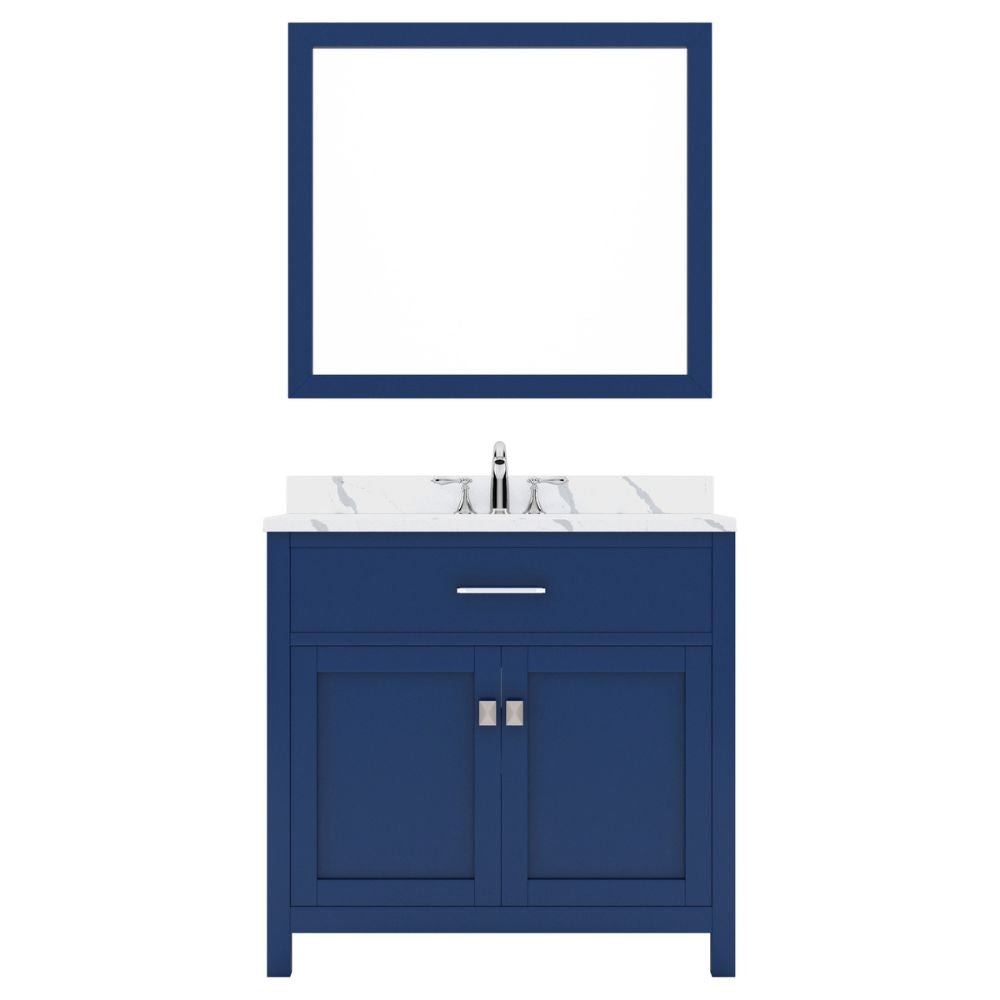 - Includes - 36" French Blue Cabinet, Calacatta Quartz Countertop, 1 Square Undermount Sink, 1 Framed Mirror, 1 Brushed Nickel Faucet