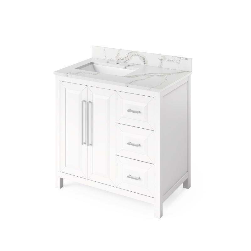 Details of the Cade Contemporary 36 Inch White Single Rectangle Sink Vanity with Calacatta Vienna Quartz Top, Left Offset by Jeffrey Alexander | VKITCAD36WHCQR