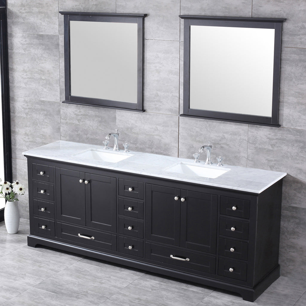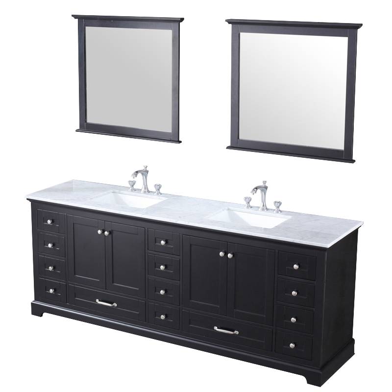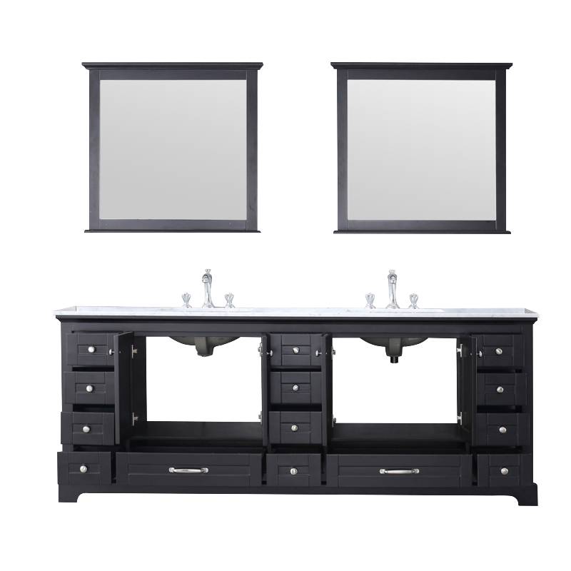 Dukes 84 Inch Espresso Double Vanity, White Carrara Marble Top, White Square Sinks and 34 Inch Mirrors w/ Faucets by Lexora | LD342284DGDSM34F