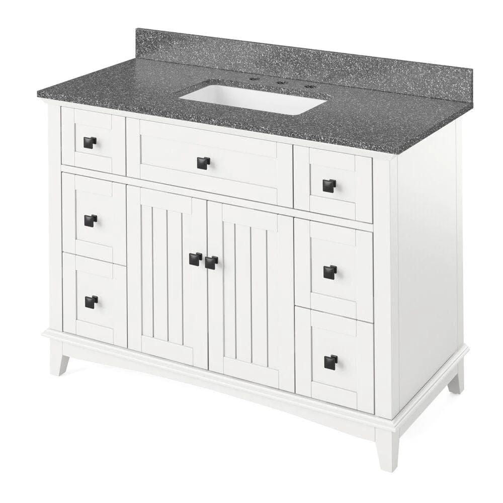 Details of the 48" White Savino Vanity, Boulder Cultured Marble Vanity Top, undermount rectangle bowl by Jeffrey Alexander | VKITSAV48WHBOR